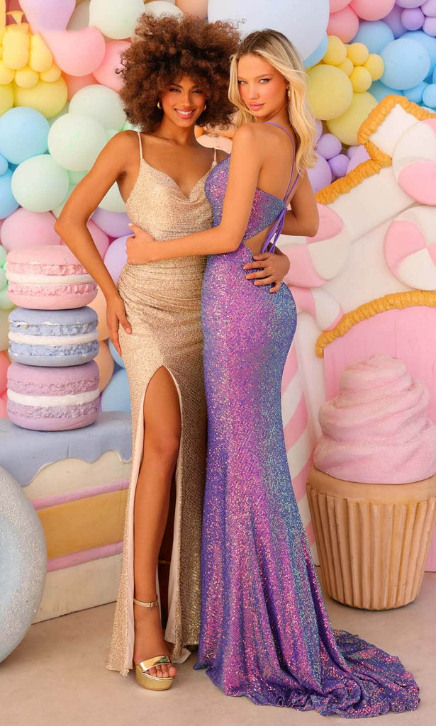 Step into the spotlight and take center stage with the Clarisse 810937 creation. Reveling in the glamour of this sequin draped silhouette, this tantalizing evening gown is designed with a form-fitting silhouette with a cowl style neckline hanging from spaghetti straps. Gorgeously detailed with a cutout on the small of the back, a captivating front slit graces the sheath skirt as it flows into a shimmering train. Be destined to capture the spotlight and draw all eyes in this Clarisse 810937 masterpiece. Models are wearing the Iridescent Champagne and Iridescent Purple colors.