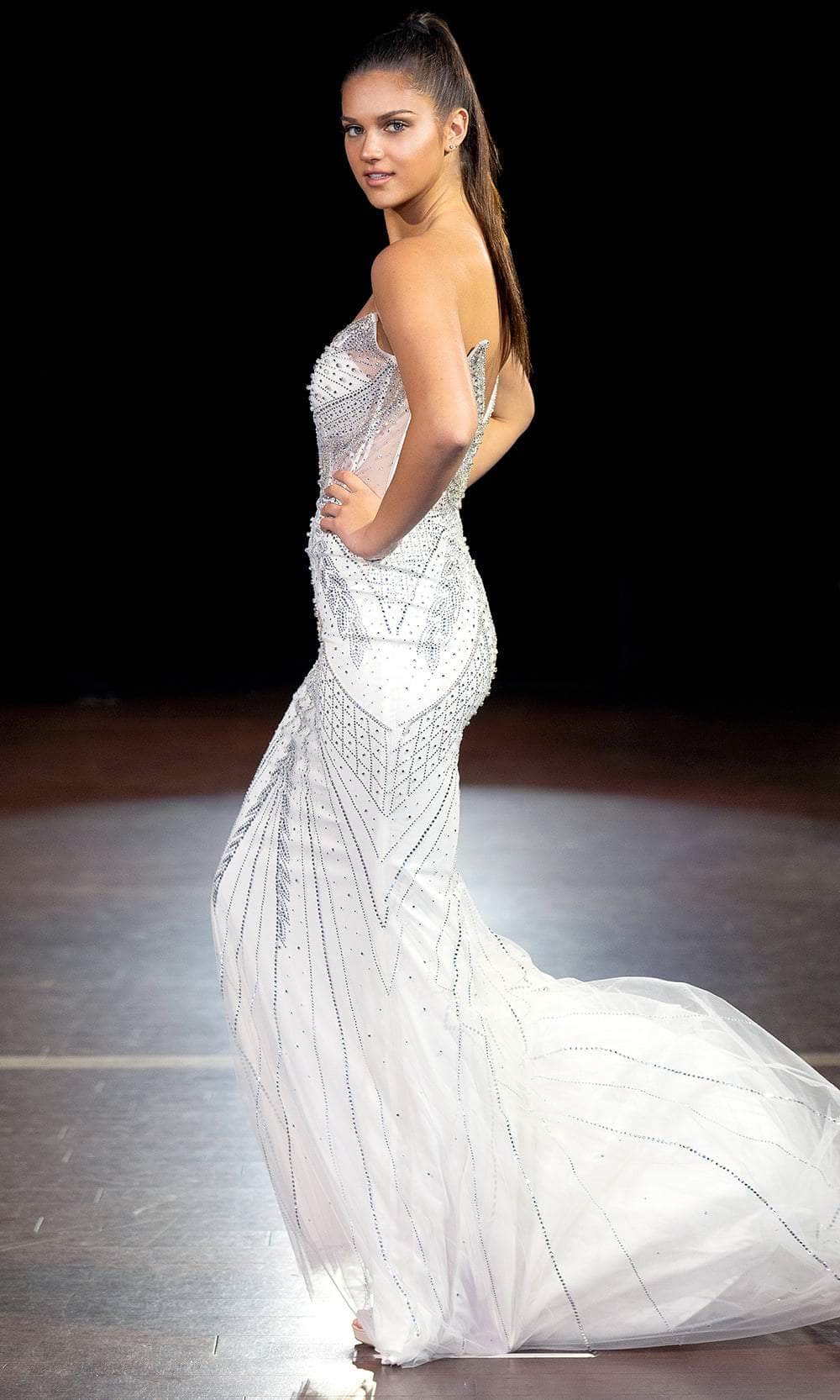 Capture a glamorous look effortlessly with this Clarisse 811127 creation. Elaborate beadwork decorates this fitted gown, making it truly unforgettable and sparkling. The deep V-neckline and strapless style bring graceful emphasis to your collarbones. A sheer corset bodice has exposed boning to enhance your figure, while the V-shaped back is captivatingly secured by the concealed zipper closure. The sheath silhouette of the skirt flows exquisitely to floor length and finishes with a stylish sweep train. This Clarisse 811127 long gown guarantees you will be the queen of the prom night. Model is wearing White color.