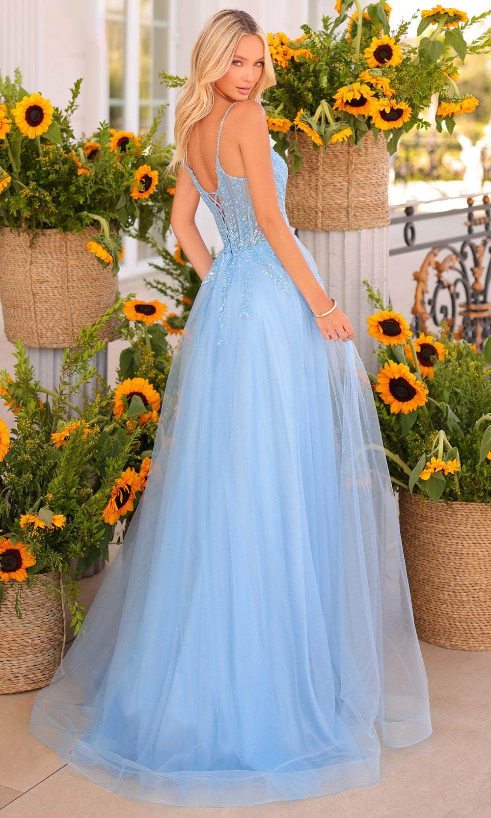 Sparkle with utmost elegance as you radiate a regal style in this Clarisse 811151 prom dress. This dress exhibits an alluring illusion scoop neckline on a sheer top, also featuring spaghetti straps for added support. It also reveals an endearing mid-open back that is secured with lace for a sophisticated finish. Additionally, the top is beautifully designed with leaf embellishments, while the floor-length skirt showcases a high slit that further elevates the overall appeal of this attire. Radiate pure elegance as you dance the night away in this fantastically ornate Clarisse 811151 creation. Model is wearing Powder Blue color.