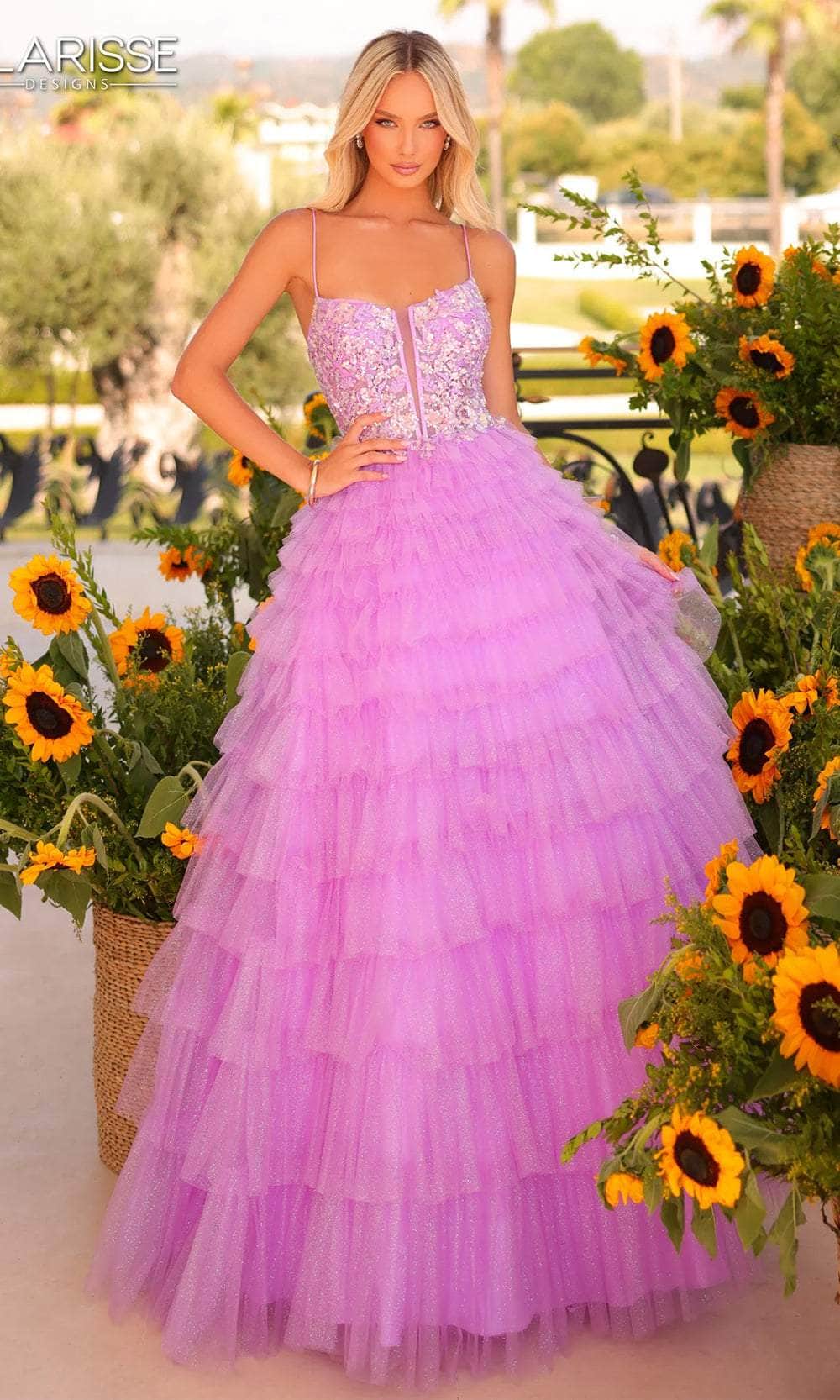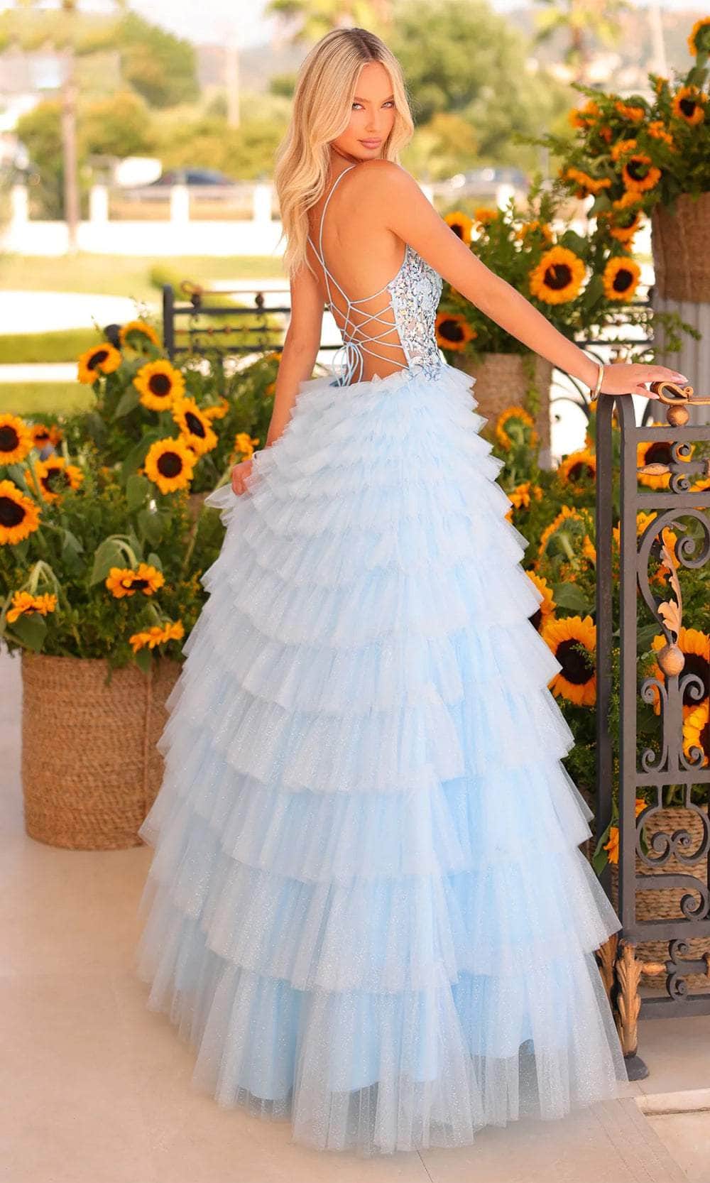 Radiate elegance in Clarisse 811155, a breathtaking ballgown that combines classic charm with modern details. This gown features a wide V-neckline with a glitter-embellished bodice that catches the light beautifully, while thin straps add a delicate touch. The pleated and ruffled full-length skirt flows gracefully, creating a striking silhouette as you move. A lace-up open back offers both style and adjustability, making this gown a perfect choice for any formal occasion. Make a memorable entrance with this stunning design from Clarisse 811155. Model is wearing Light Blue, and Orchid colors.