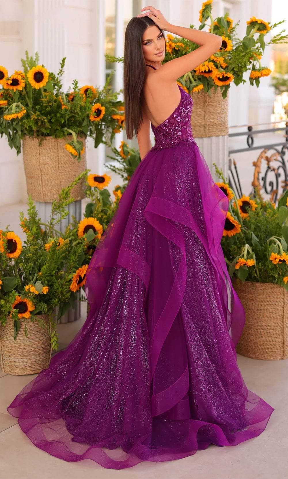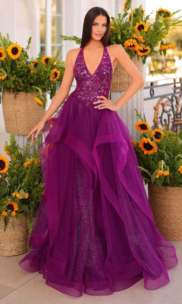 Radiate elegance in Clarisse 811281, a stunning halter ballgown that perfectly combines glamour and grace. The dress features a sequined bodice that shimmers beautifully, paired with a glitter skirt that flows into a floor-length silhouette, finished with a refined horsehair hemline. The open back adds a touch of allure, while a back zipper closure ensures a secure and comfortable fit. Make a lasting impression at any formal event with this exquisite design from Clarisse 811281. Model is wearing Plum, Red, and Royal colors.