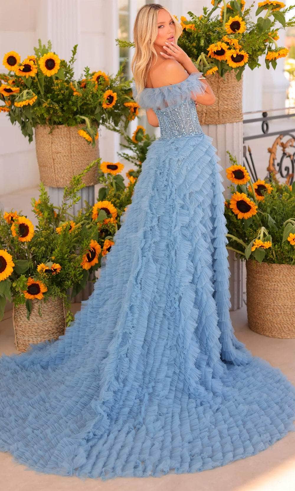Elevate your style with Clarisse 811332, a stunning ballgown that combines glamour and versatility. This fully sequined dress features a sweetheart neckline, accented by detachable ruffled straps and a dramatic overskirt that can be removed for a customized look. The silhouette is enhanced by a side slit and flows into a long train, creating graceful movement. A mid-open back with a secure back zipper ensures a flawless fit. Make a memorable entrance with this captivating design from Clarisse 811332. Model is wearing Slate Blue color.