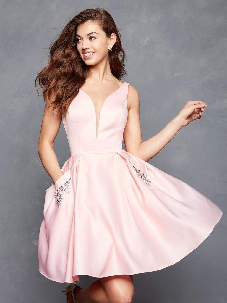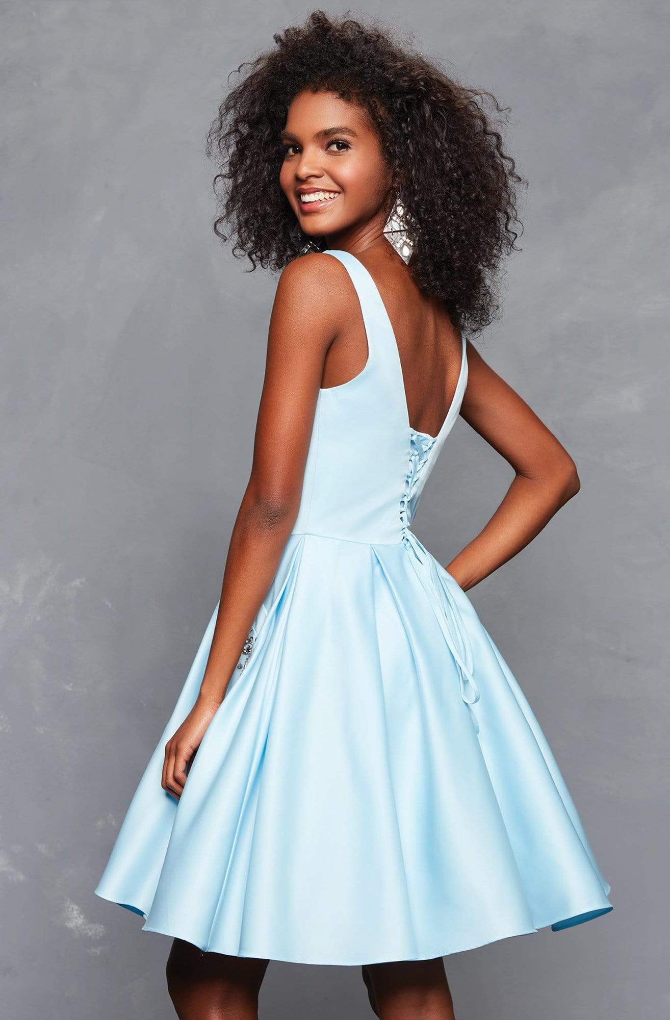 A beautiful fit and flare satin dress with deep cut V neckline fitted front bodice with sheer inset at the center and a corset lace-up back style. Box pleats start from the cinched waist and give the dress a striking A-line skirt. The dress features crystal bead pockets on each side of the skirt and provides a short, mid-thigh length finish.