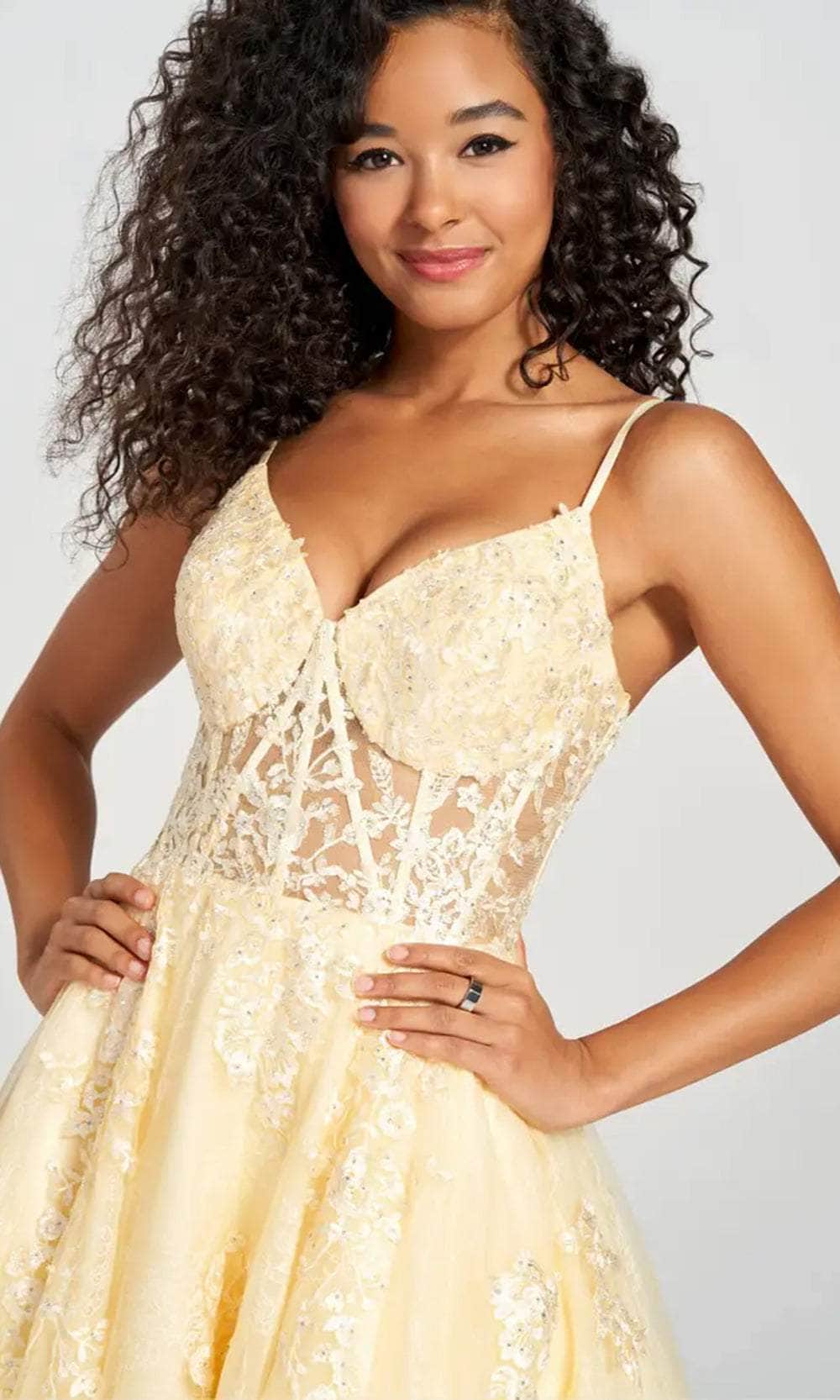 You will surely be the life of the party when you wear this Colette CL12202 ballgown. This dress is made of Tulle fabric with Beaded appliques and lace accents. Features a sleeveless design with a V neckline that is supported by spaghetti straps. Has a cinched natural waistline with a floor length A line skirt and the back features a lace up style. Be fabulous in this alluring dress by Colette The model is wearing the Buttercup color