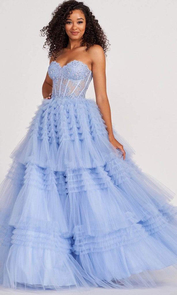 Be fabulous and get ready for everyone to stop and stare when you show up in this beautiful long dress by Colette By Daphne CL2017 masterpiece. The corset bodice is lavishly adorned with glittering rhinestone embellishments. This piece offers a sweetheart neckline paired with a mid-open back. The back is secured with a lace-up tie and zipper closure, and the ruffled tulle skirt parades in a ballgown silhouette. You'll be envied in this unbeatable ensemble from the Colette By Daphne CL2017 collection. Models are wearing Diamond White, Dusty Rose, Periwinkle and Turquoise colors.