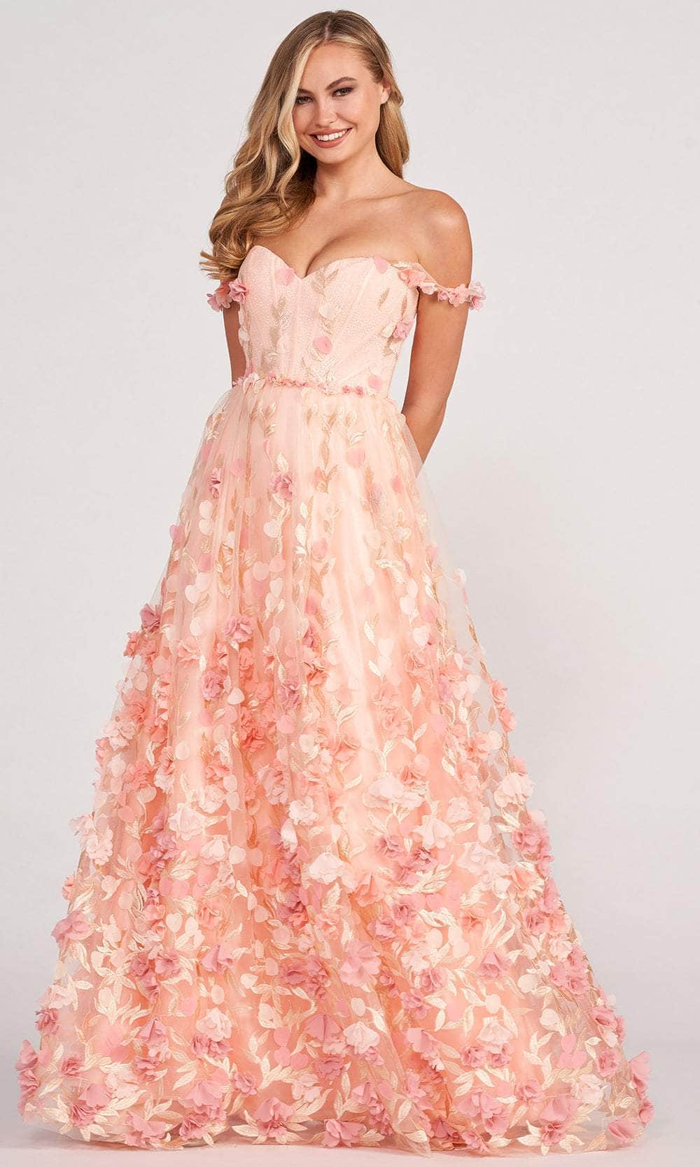 Strike a pose as you enter the room in this exquisite Colette By Daphne CL2057 prom dress. This phenomenal dress is a sure standout with its magnificent embellishments of embroidered leaf and three-dimensional floral appliques. The A-line skirt offers a graceful silhouette, highlighting a cinched waist with the corset top. A sweetheart neckline belies the fitted bodice, framed by off shoulder straps. The night is yours in a spectacular gown from Colette By Daphne CL2057. Model is wearing Apricot color.