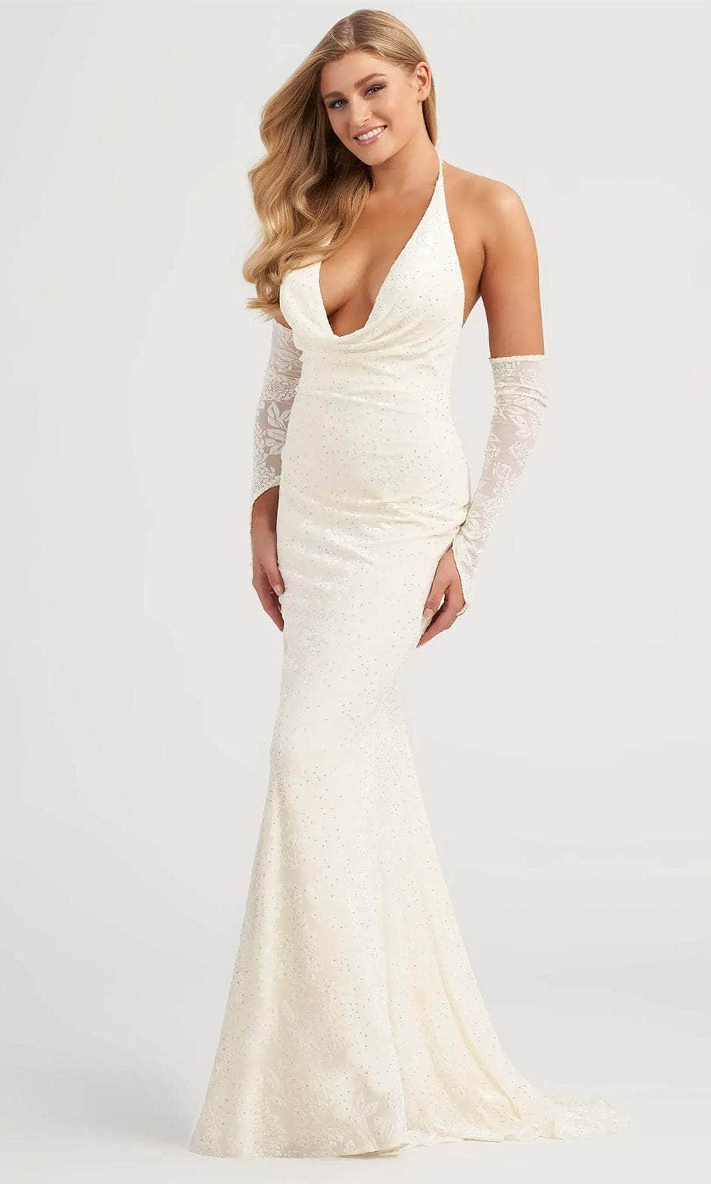 Showcase the essence of grace and sophistication in this enchanting Colette By Daphne CL5118 creation. Fashioned in a beaded burnout velvet silhouette and detailed with sculpting lines, this beauty boasts a sleeveless bodice with a plunging halter neckline. Designed with a cowl detail and a backless feature, the skirt of this stunner expertly sculpts the feminine silhouette, finishing with an elegantly draping train. Included with this ensemble are matching fingerless gloves. Radiate poise and grace with this sophisticated and graceful Colette By Daphne CL5118 creation. Models are wearing the Black, Pink, Diamond White, and Jade/Berry colors.