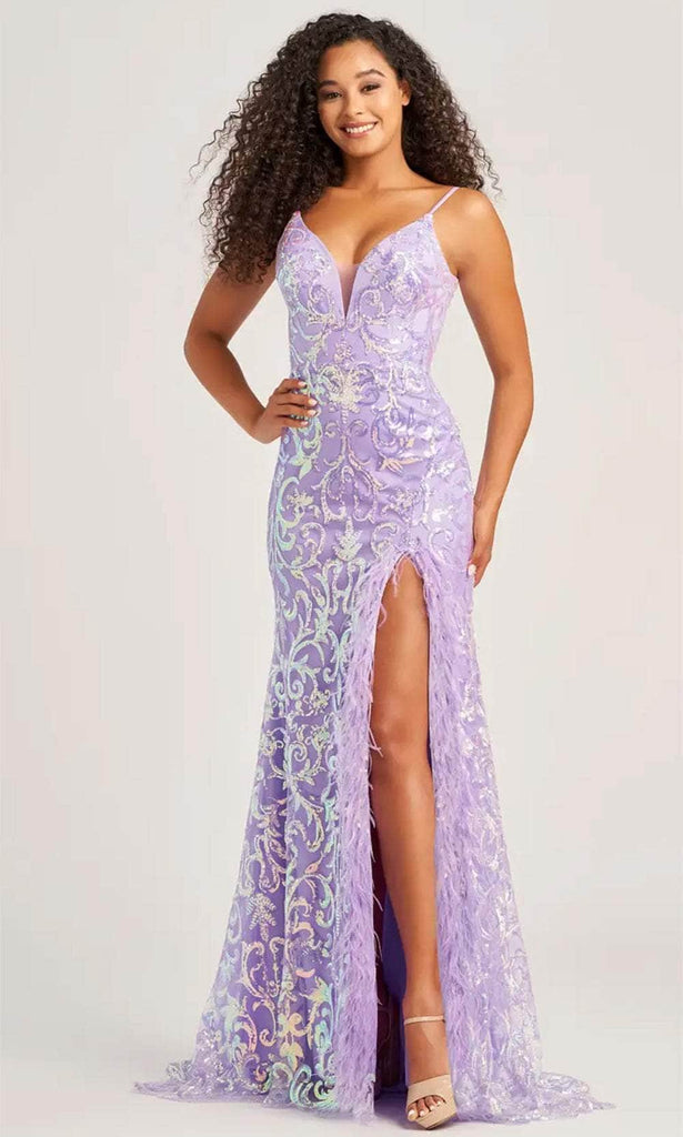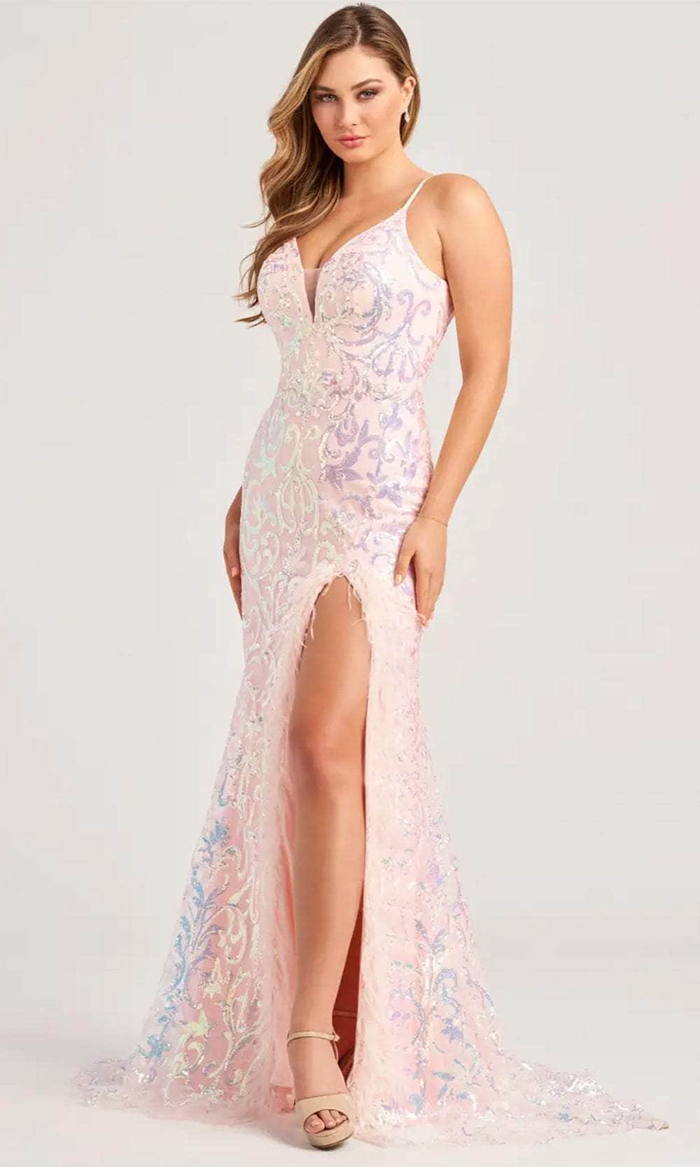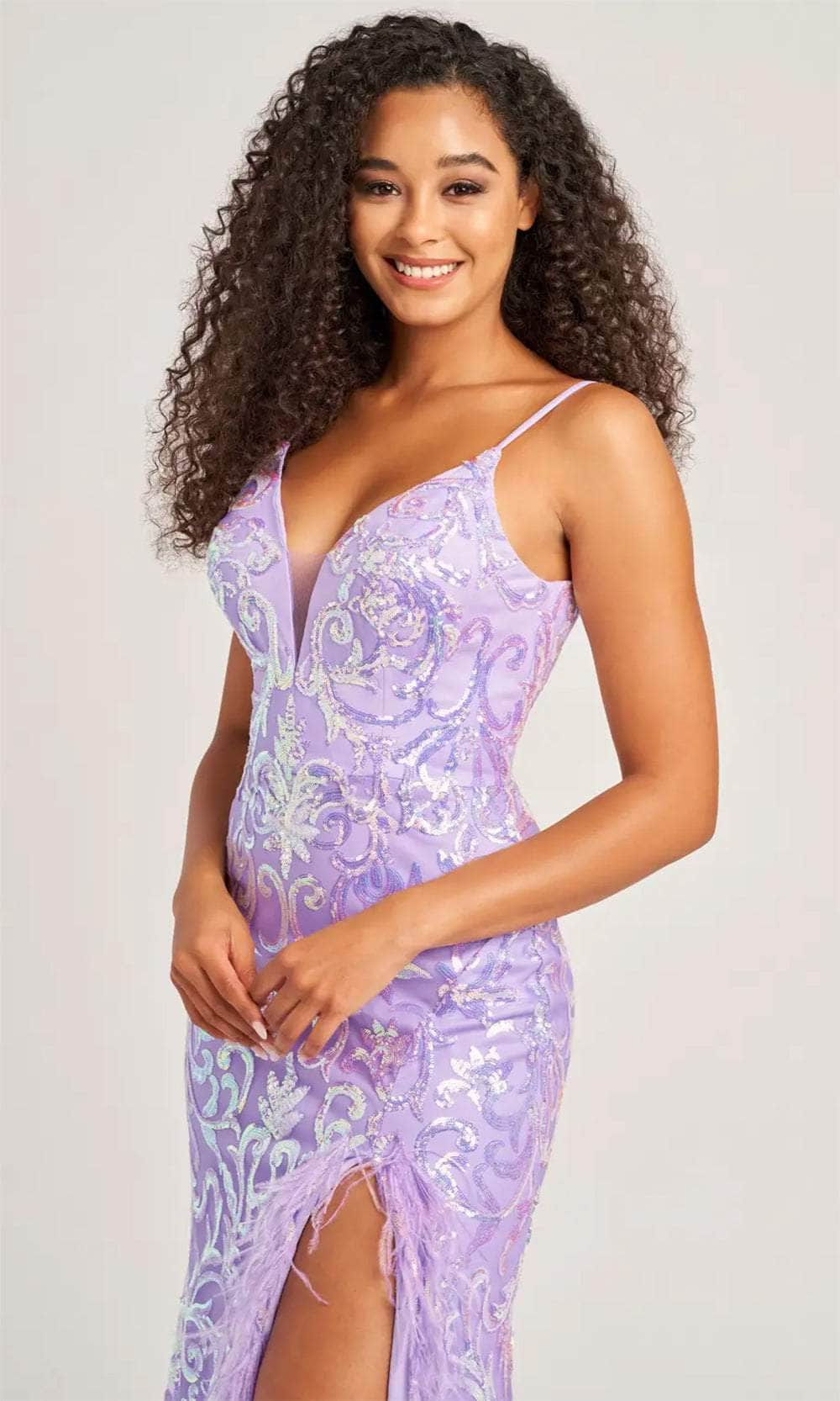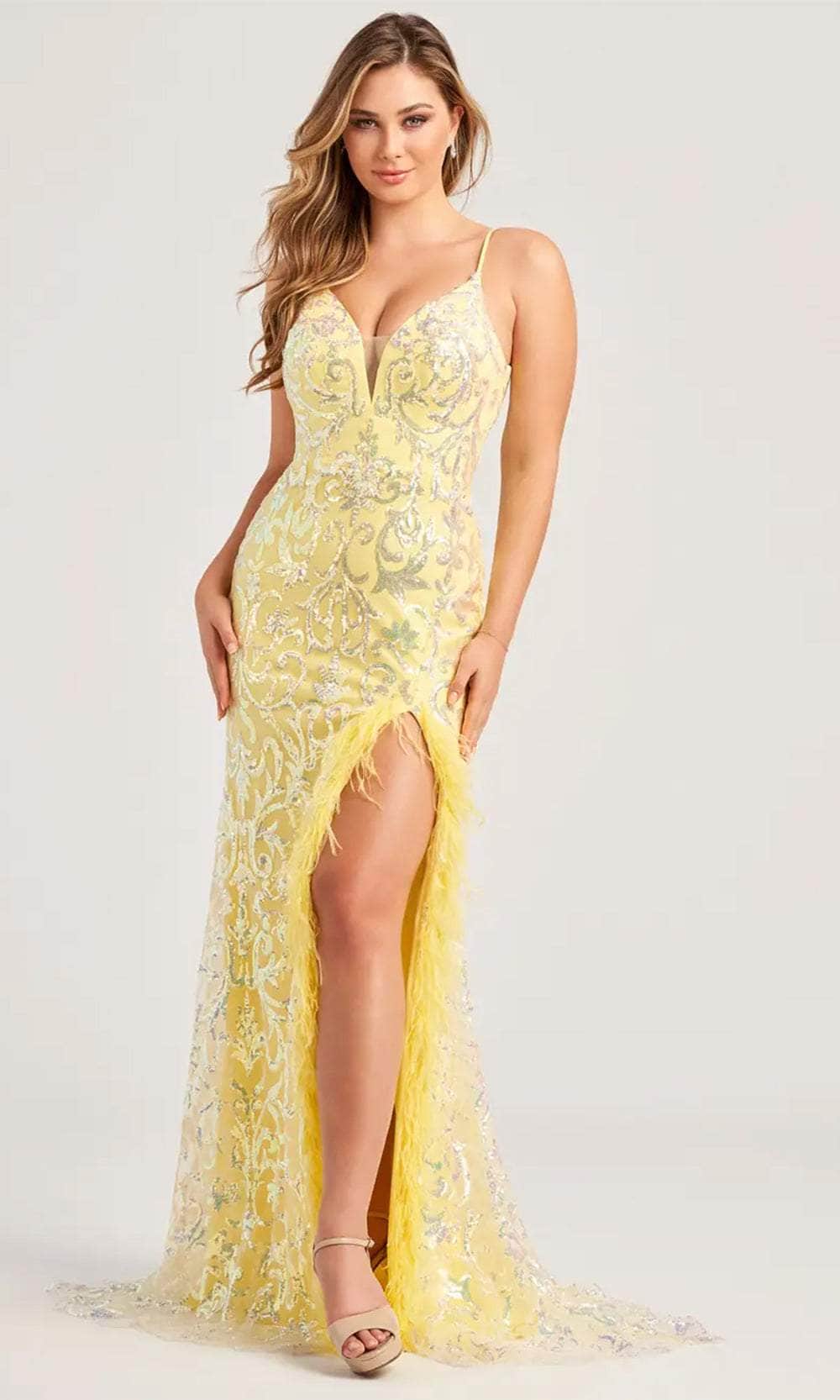 Experience the magic of the Colette By Daphne CL5155 gown as you dance through the night. Constructed from playful sequin tulle that molds to the contours of the feminine figure, this dress showcases a daring plunging V-neckline complemented by an illusion inset. The bodice, secured by spaghetti straps, shapes a alluring low V-back. Thedramatic touch of the gown comes from a high front slit adorned with feathers, adding excitement to the glittering designer piece. With a graceful sweep train, this Colette By Daphne CL5155 creation makes a striking statement, blending modern edge with classic elegance. Models are wearing the Light Pink, Lilac, Steel Blue, and Yellow colors.