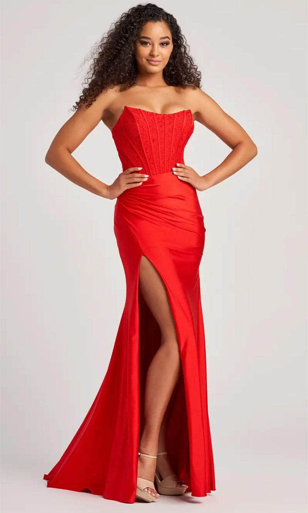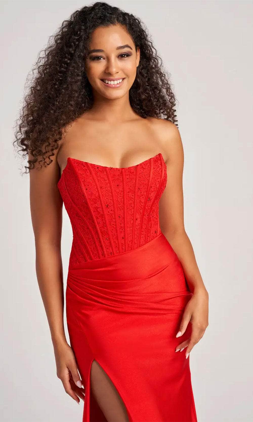 Command attention and enchant hearts with this eye-catching and intricately crafted Colette By Daphne CL5158 ensemble. Shaped with a corset bodice adorned in bead embellished lace, this gown unveils a strapless bodice featuring a scoop neckline. Designed with a low laced-up back secured with grommets, the sheath skirt is fashioned from spandex jersey. The ensemble is completed with draping, a thigh-high slit, and a sweep train. The set includes detachable spaghetti straps, allowing you to captivate attention with elegance in the Colette By Daphne CL5158 creation. Models are wearing the Black, Red, Hunter, Violet, and Hot Pink colors.