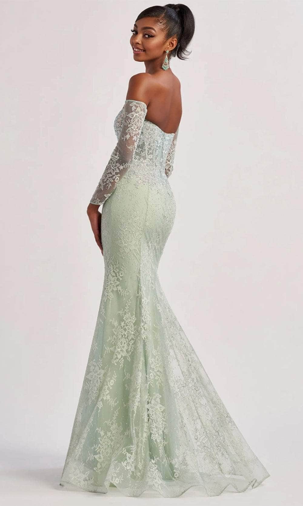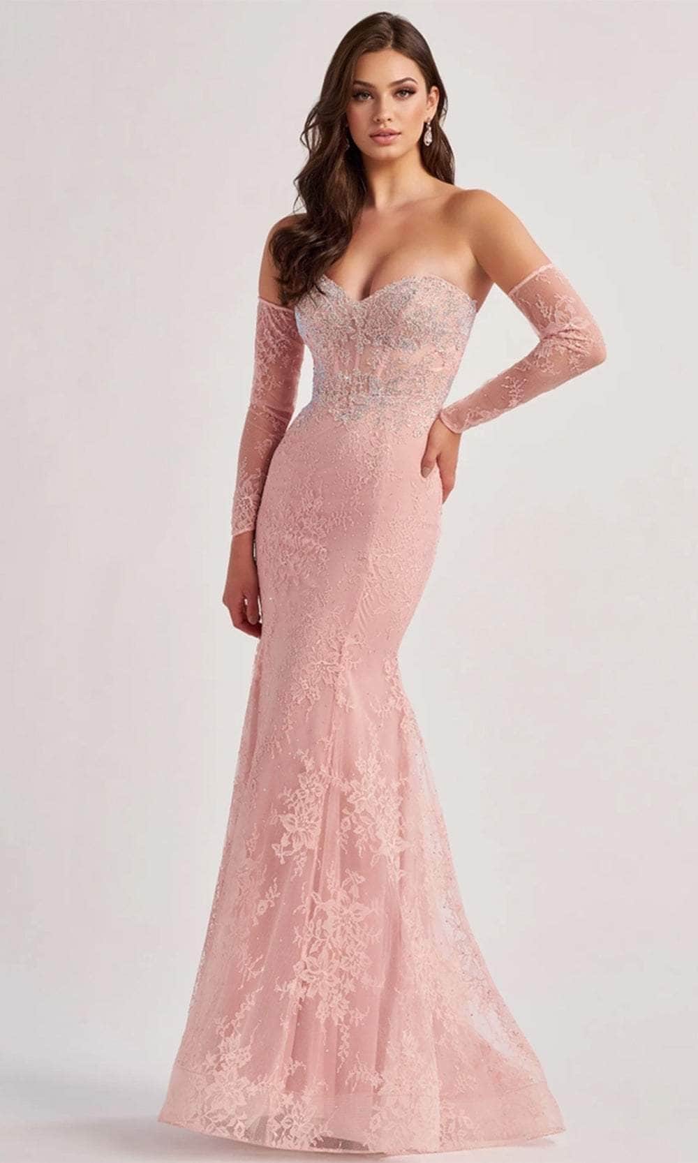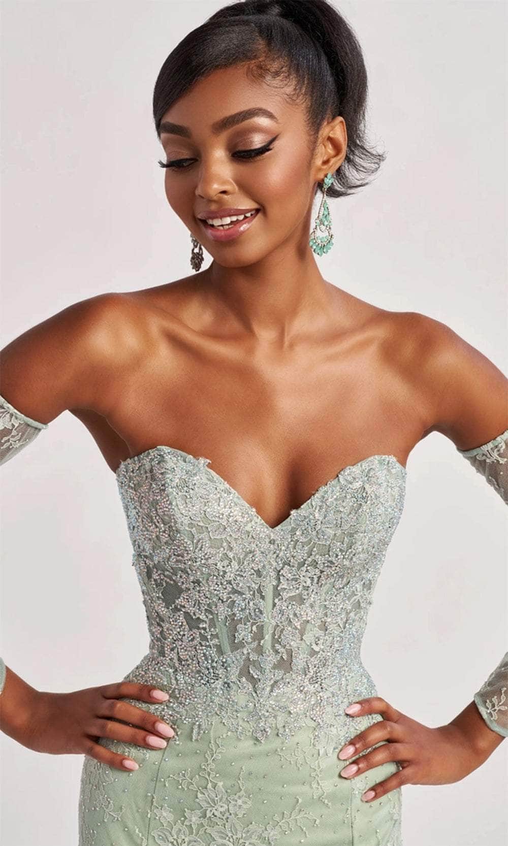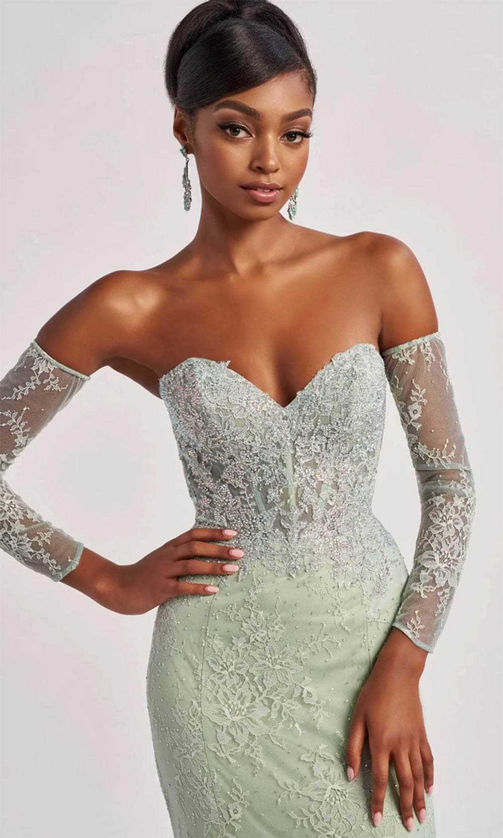 Discover the perfect blend of modern flair and classic charm with this stunning gown from Colette By Daphne CL8415 gown. Crafted from luxurious allover lace and tulle adorned with shimmering accent stones, this gown exudes sophistication and allure. The strapless sweetheart neckline highlights your décolletage, while the corset bodice sculpts your figure with a flattering fit. The gown features detachable gauntlet sleeves, adding a touch of drama and versatility. The natural waistline creates a graceful silhouette that flows into a sweeping train. This Colette By Daphne CL8415 masterpiece is perfect for any grand occasion, where you'll leave a lasting impression with its blend of classic design and contemporary elegance. Models are wearing the Light Sage, Pink, and Black colors.