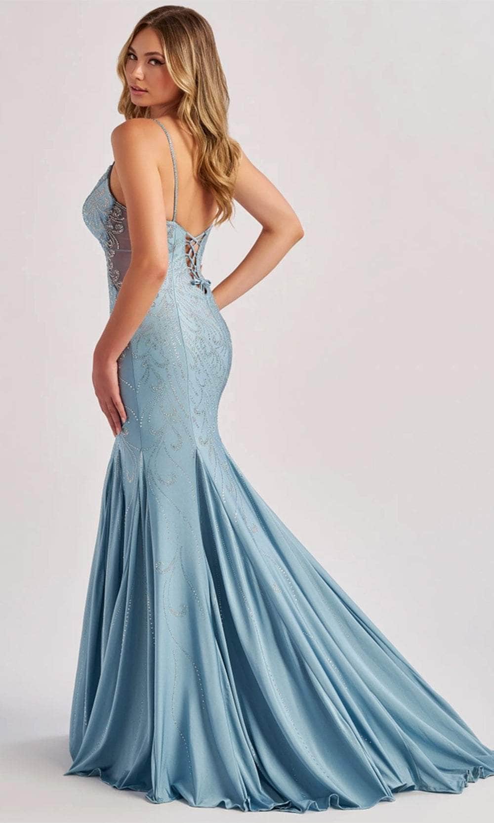 Step into the spotlight with the Colette By Daphne CL8550 gown, a beautiful fusion of contemporary style and classic sophistication. Made from high-quality stretch jersey, the gown shimmers with sparkling patterned stones, creating an ethereal, eye-catching effect. Spaghetti straps lead to a plunging V-neckline, while sheer side cutouts provide a tantalizing glimpse of skin. The lace-up back enhances the gown’s allure, and the mermaid skirt, complete with a sweeping train, makes a grand statement. This Colette By Daphne CL8550 gown is perfect for any occasion that calls for elegance. Model is wearing the Dusty Blue color.