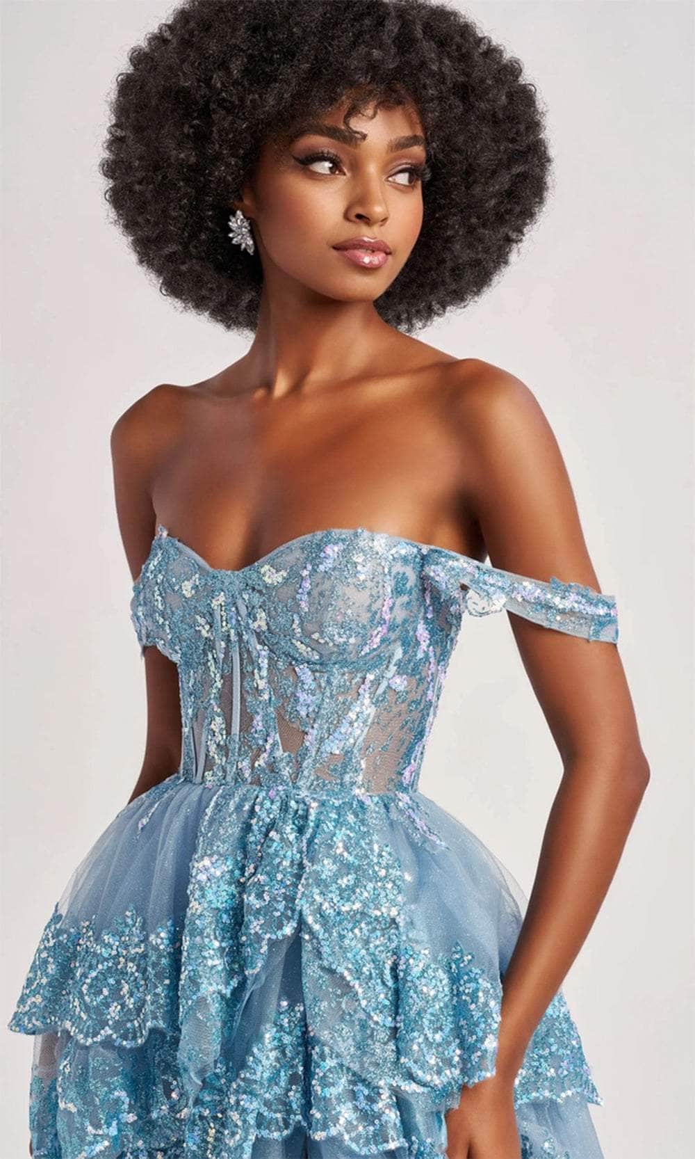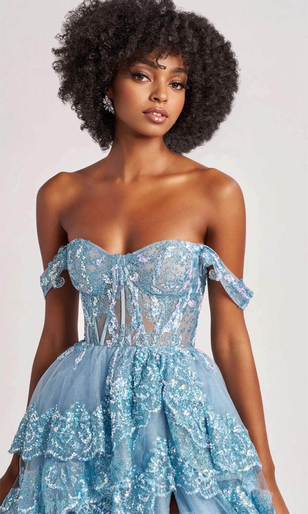 With the Colette By Daphne CL8690 gown, elegance isn’t just something you wear; it’s a part of you. Crafted from shimmering tulle and glitter tulle, its tailored lines enhance the body's natural curves. The sheer corset bodice, adorned with intricate cracked ice appliqués and glimmering stones, creates a captivating spectacle. The off-shoulder neckline combined with a lace-up back offers both charm and structure. The A-line skirt, featuring scalloped tiers and a high slit, adds a dramatic flair and sophistication. Embrace the essence of luxury with the Colette By Daphne CL8690 gown, a stunning piece that defines refinement. Models are wearing the Pink and Blue colors.