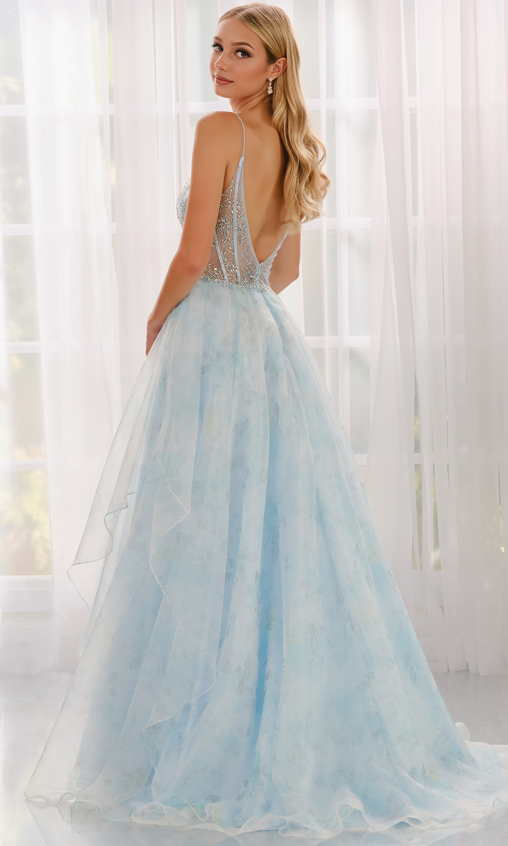 Soft, flowing layers of printed chiffon come together to create an enchanting silhouette, and Colette CL6010 captures this whimsical beauty with masterful detail. The fitted beaded bodice glistens under the light, framed by a flattering V-neckline and slender straps that add a delicate, feminine touch. Its natural waist gives way to a voluminous A-line skirt, cascading in airy tiers that move gracefully with every step. The floral print lends a hint of romance, while the full-length design creates an effortlessly elegant presence. Perfect for prom nights or garden-inspired events, Colette CL6010 embodies refined femininity wrapped in ethereal charm. Models are wearing Light Blue Floral, and Pink Floral colors.