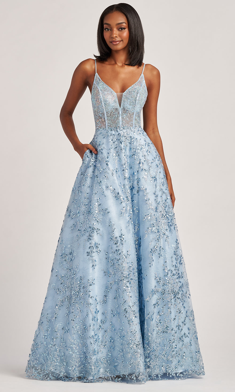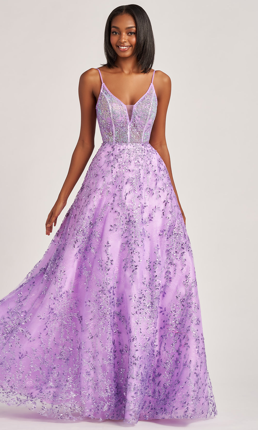 A vision of enchantment unfolds with the dreamy Colette CL6019, capturing the essence of whimsical beauty. Made from novelty glitter fabric, this sleeveless gown sparkles with every movement, giving a soft, fairytale radiance. Its plunging V-neckline and delicate spaghetti straps enhance the shoulders, while the sheer corset bodice with visible boning creates a defined yet romantic structure. The voluminous A-line skirt floats gracefully, featuring glimmering beaded embroidery and sequin that catches the light effortlessly. Perfect for prom, pageants, or elegant soirees, Colette CL6019 embodies a timeless charm that feels both magical and modern. Models are wearing Lt.Blue, and Orchid colors.