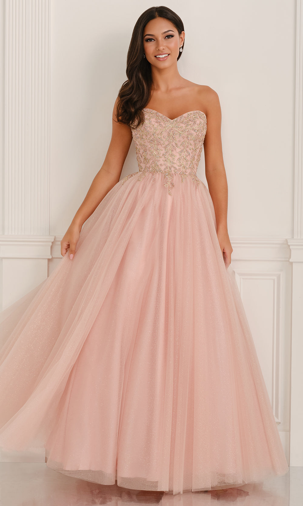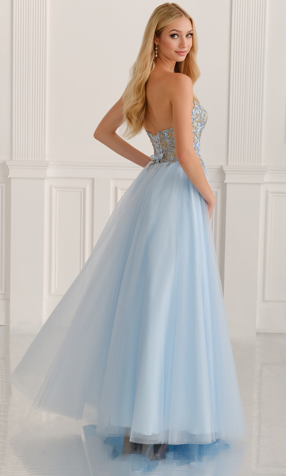Step into refined beauty with the Colette CL6111 gown, an enchanting design created for the woman who adores classic romance. The strapless sweetheart neckline draws attention to the delicately embroidered bodice enriched with beaded highlights. Layers of airy tulle flow from the natural waistline, creating a majestic A-line silhouette that moves gracefully. The intricate craftsmanship ensures every detail glimmers with sophistication. Perfect for prom or any grand celebration, the Colette CL6111 gown captures the essence of elegance and modern charm in one unforgettable design. Models are wearing Pink, Blue, and Lilac colors.