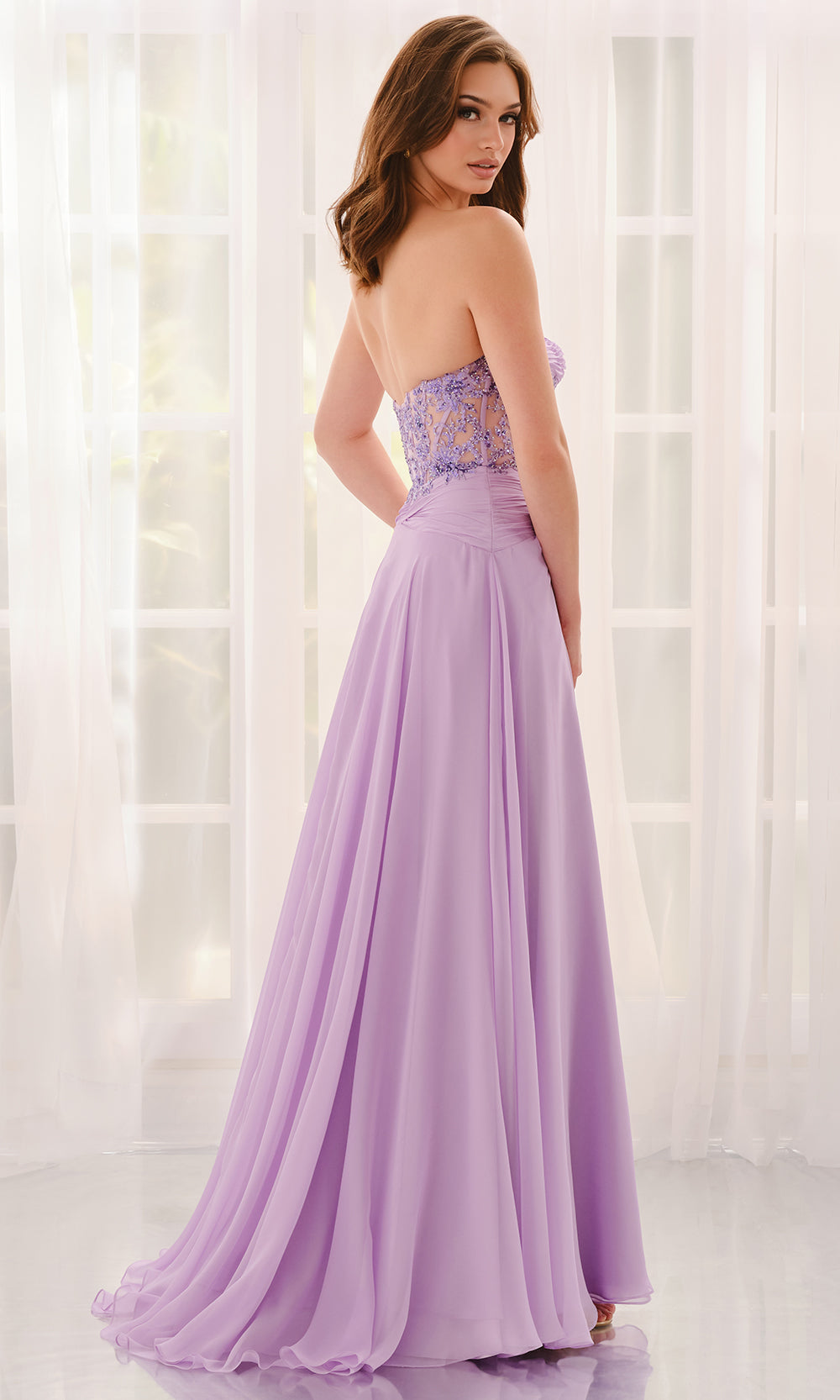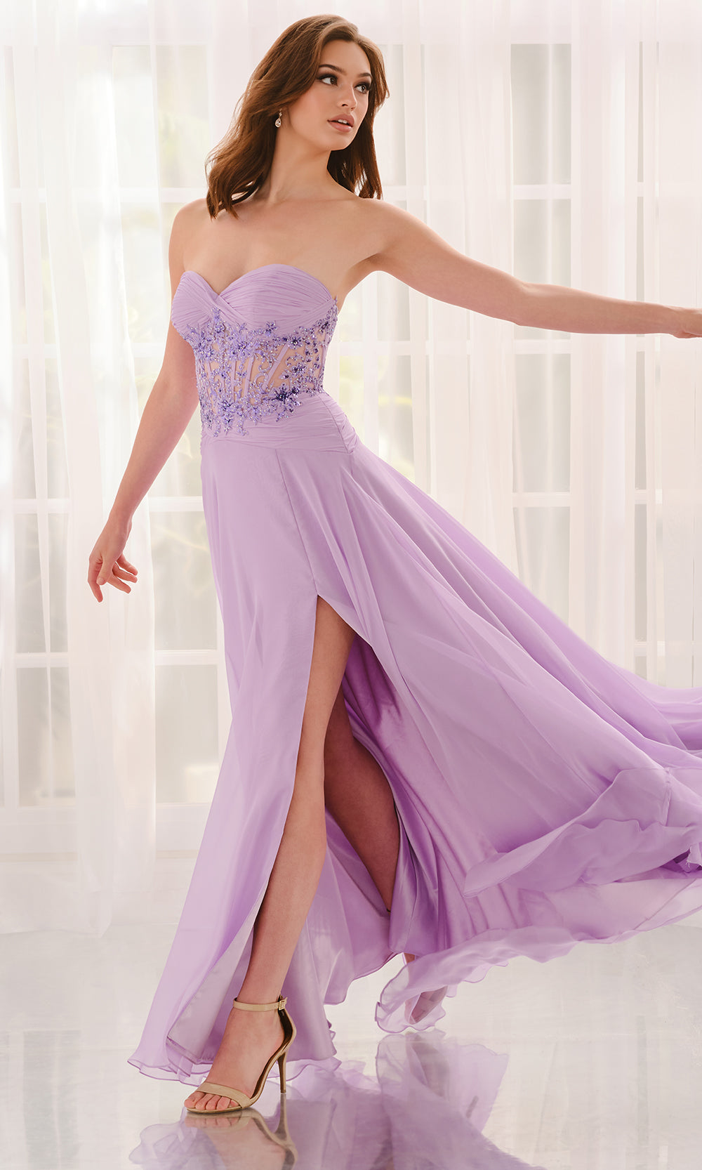 Graceful and captivating, the Colette CL6115 gown merges delicate detailing with a modern silhouette. Its strapless sweetheart neckline draws focus to the shoulders, while the embellished sheer corset bodice reveals refined artistry and precision tailoring. A flowing chiffon A-line skirt with a thigh-high slit creates effortless movement and a touch of allure. The natural waistline defines a flattering silhouette that flatters all body types. Perfect for formal events, pageants, or evening galas, the Colette CL6115 gown highlights elegance with a distinctive, contemporary charm. Models are wearing Lilac, Lt.Blue, Lt Yellow, and Pink colors.