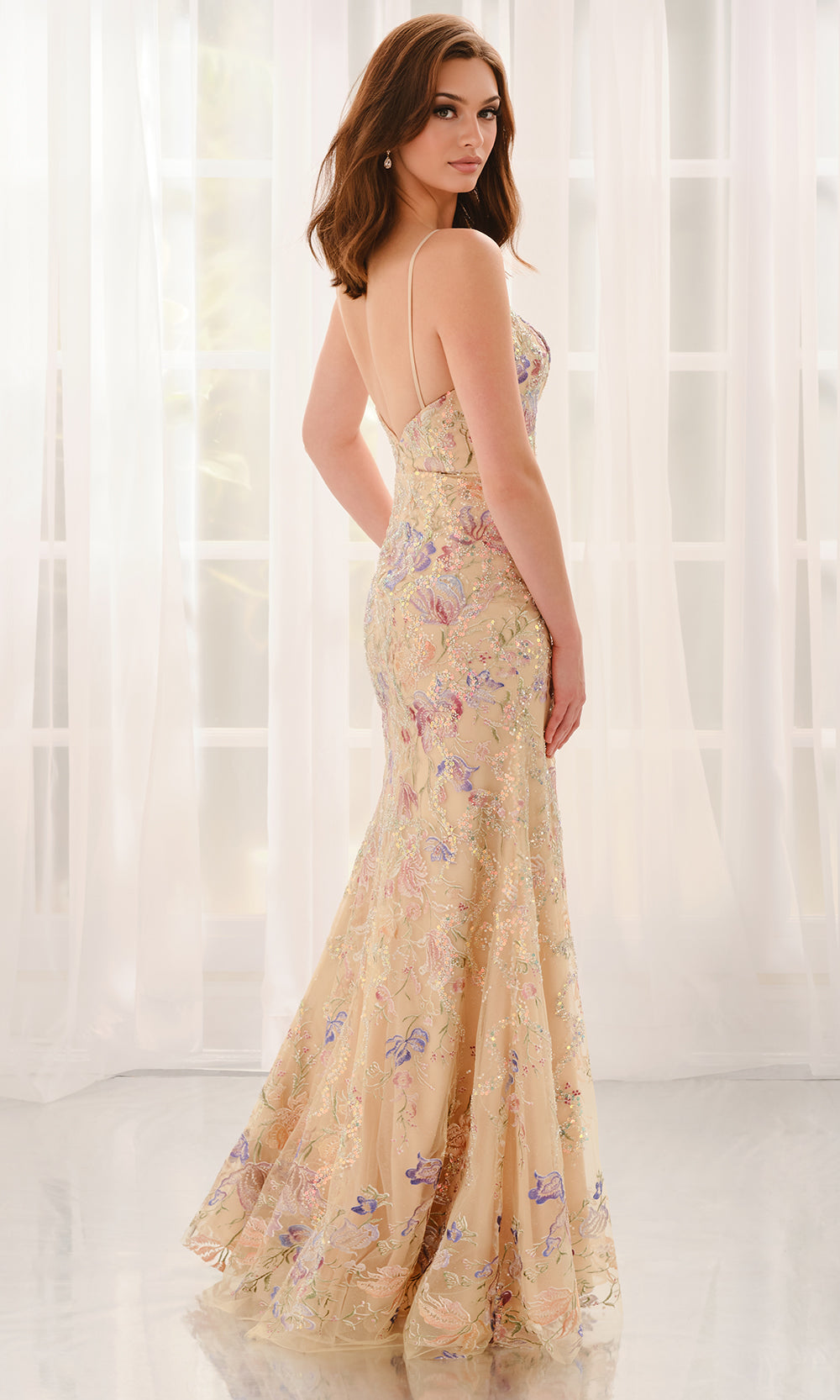 | Details: | Spaghetti Straps, Floral Embroidery, Beaded, Sequin, High Slit, Low Open Back, Floor-Length |