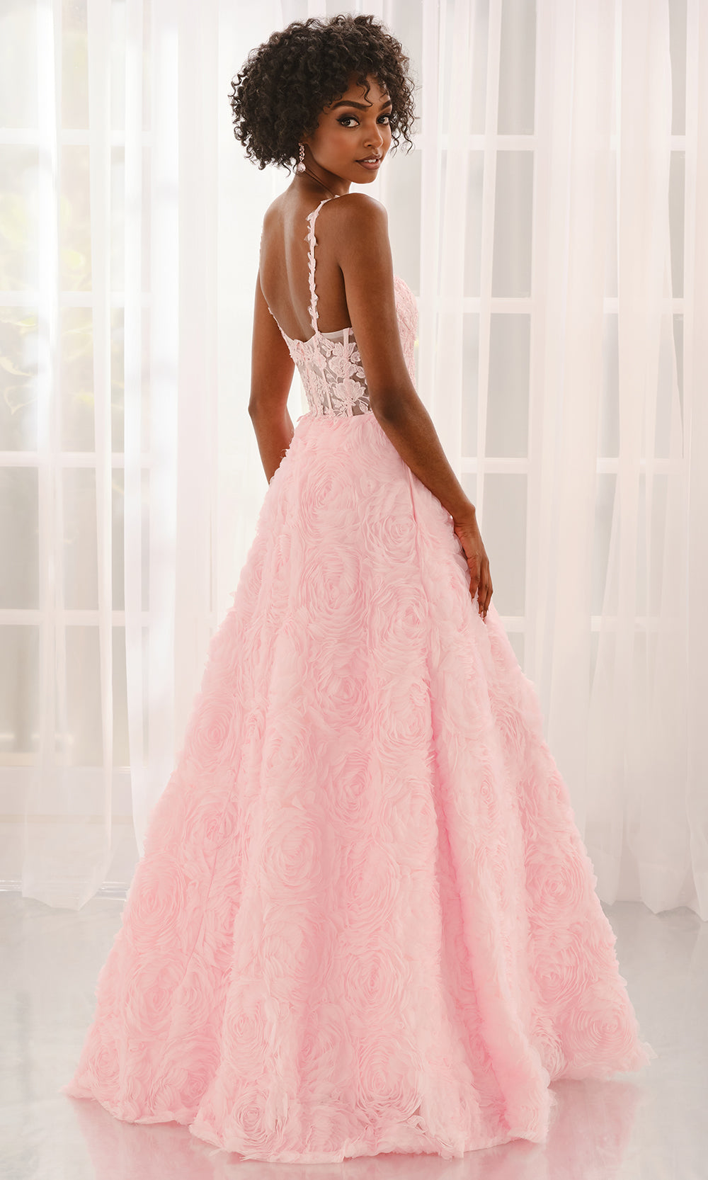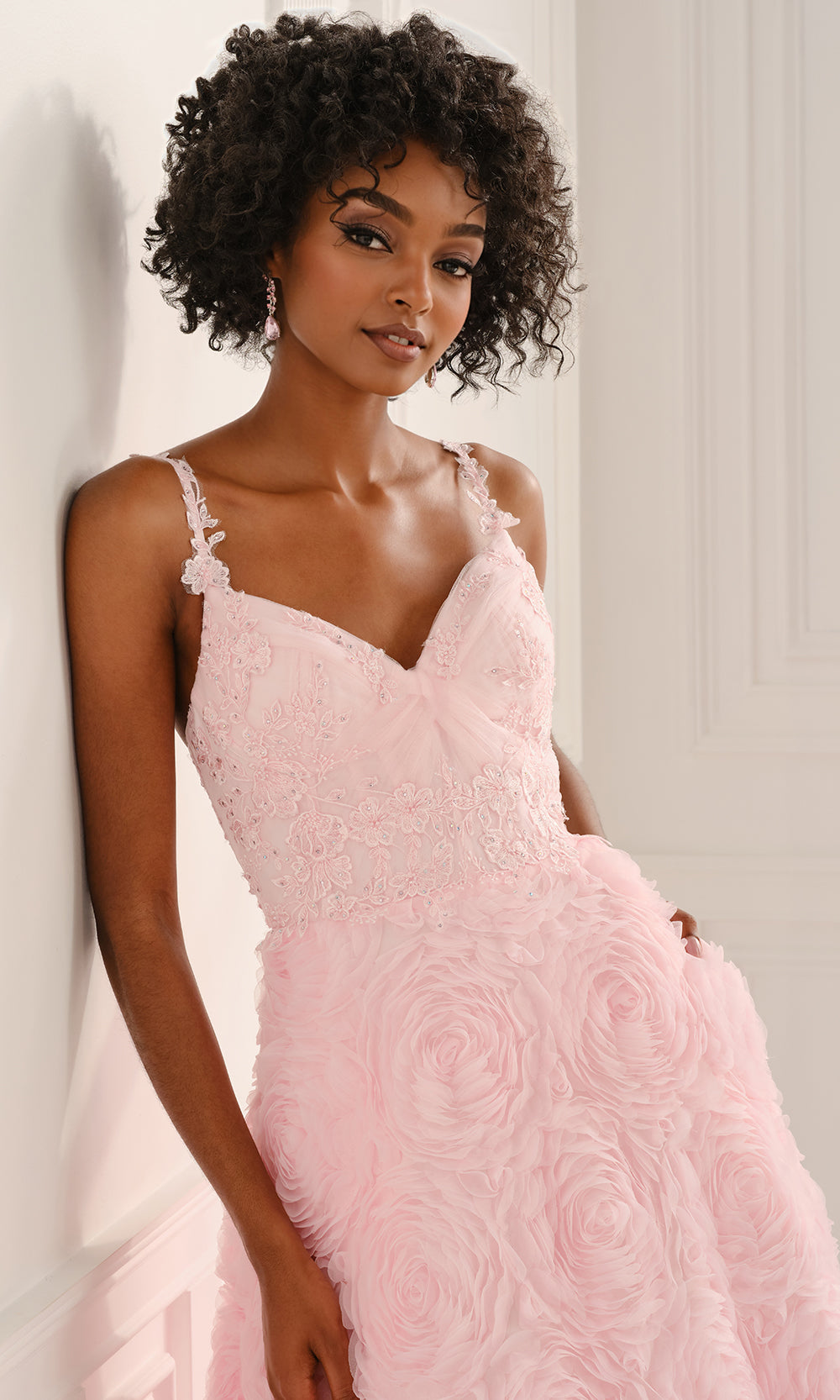 Regal texture and couture detailing define the exquisite artistry of Colette CL6223, a gown that radiates statement elegance. This captivating design showcases a fitted bodice adorned with lace applique and delicate shimmer, framed by slim spaghetti straps and a romantic sweetheart neckline. From the natural waist, the voluminous ballgown skirt blooms in layers of three-dimensional rosettes, each petal reflecting the artistry of high couture. Colette CL6223 captures fairytale grandeur for the woman who desires luxury that feels both powerful and enchanting. Models are wearing Light Pink, and Navy colors.