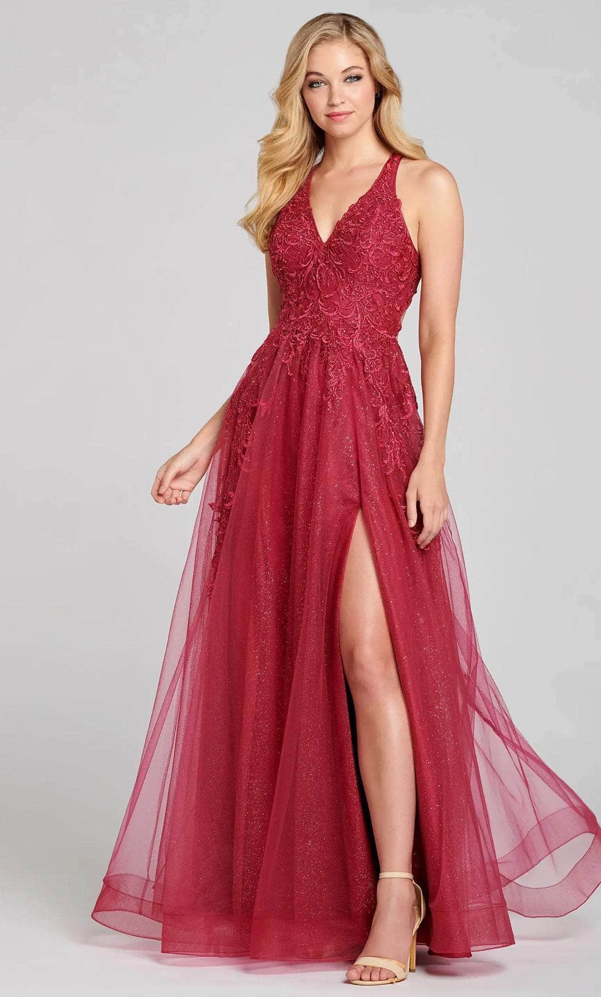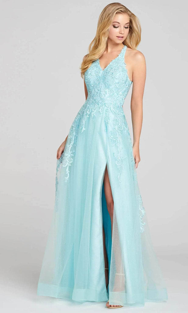 Bloom with loveliness in this detailed gown from Colette for Mon Cheri CL12120. Graces in a floral lace applique over the glitter tulle fabric, this gown is a beautiful choice for any occasion. The sleeveless bodice shows off a modest v-neckline held in place by a wide shoulder strap, and the racer back has a stunning strappy lace-up tie closure. Flaunting a high slit opening, the skirt flares a gorgeous A-line silhouette that cascades to the full length hem and sweep train. You are a breath of fresh air in this dreamy Colette for Mon Cheri CL12120 creation. Models are wearing the Aqua and Berry colors.