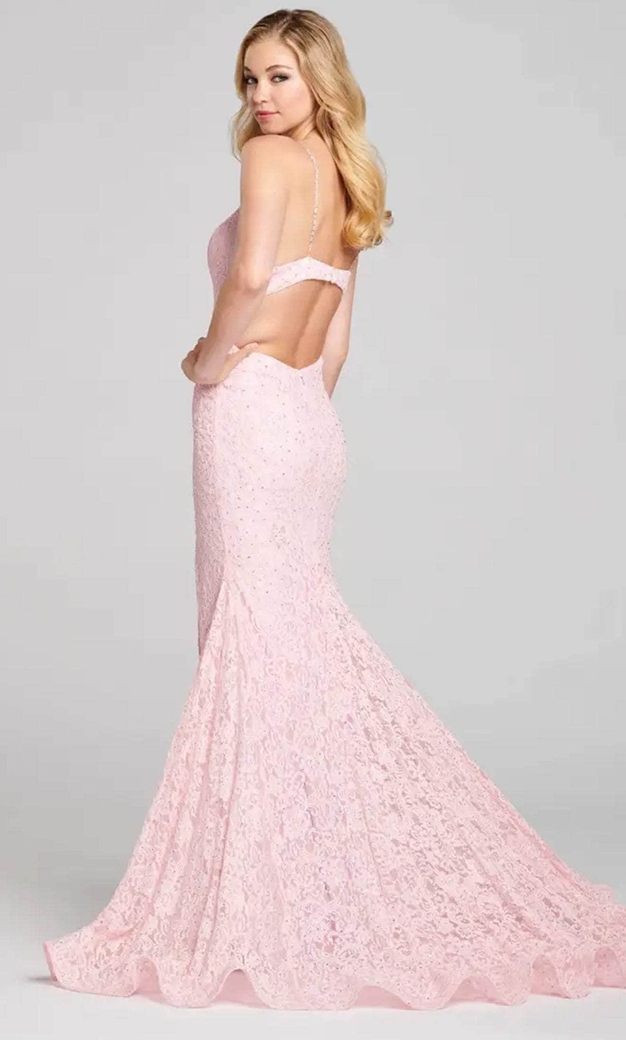Leave them speechless wearing this Colette for Mon Cheri CL12124 creation. Dress has a scoop neckline with thin straps that lead to a cutaway open back, and is fashioned from a luxurious stretch lace fabric. The stone embellishments shimmer over the exquisite lace embroidery, and the figure-flattering seaming draws emphasis to your curves. The skirt features a trumpet silhouette with a high slit and sweep train finish for a dramatic exit. Bloom with loveliness as you wear this evening dress by Colette for Mon Cheri CL12124. Model is the wearing the Pink color.