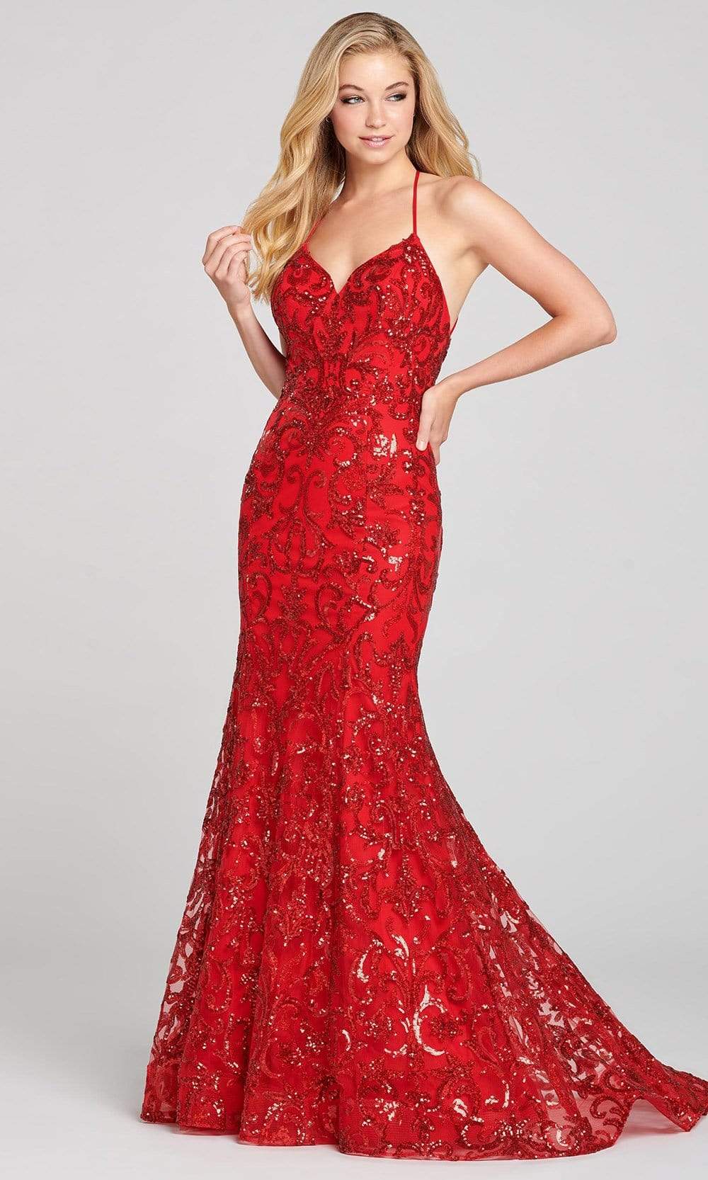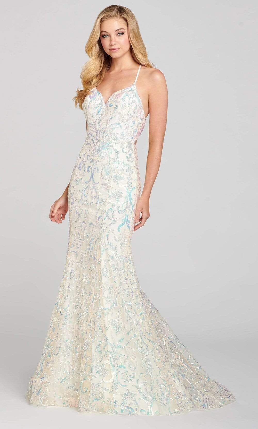 Grace the party with a timeless allure in this Colette for Mon Cheri CL12130 creation. Detailed with an intricate spectacle of sequins, this gown reveals a v-neckline on spaghetti straps. Defined with a strappy exposed back and a zipper closure, the fitted skirt glides and flares into a mermaid silhouette with a train. Lavish in the pure allure of this gorgeous Mon Cheri masterpiece.