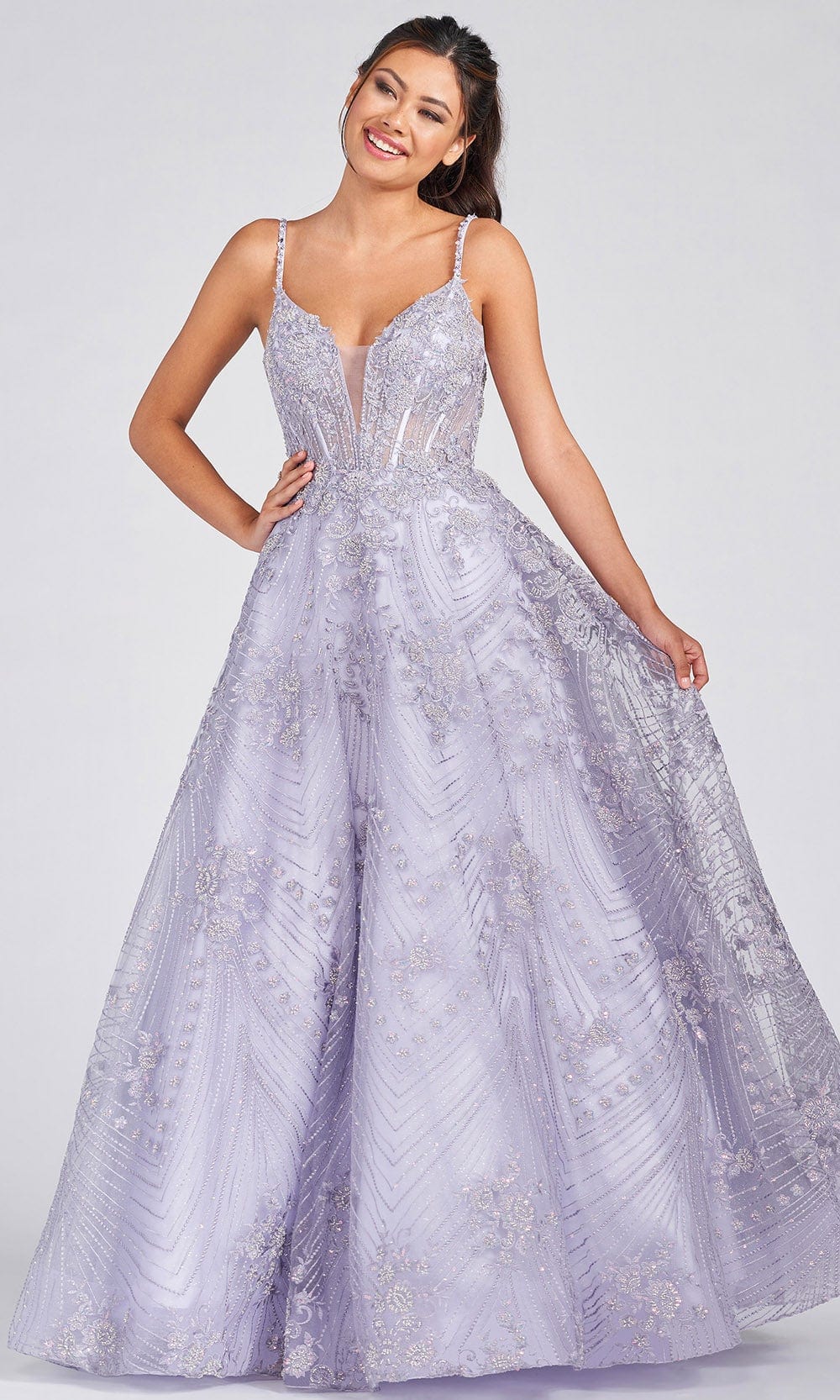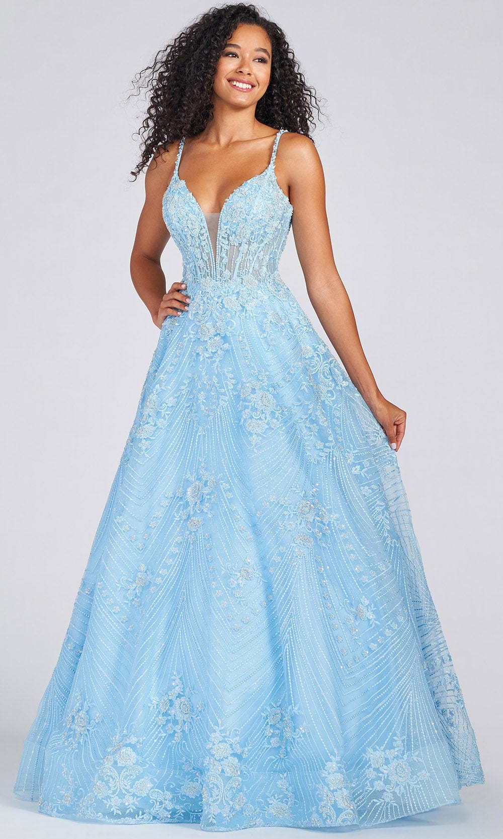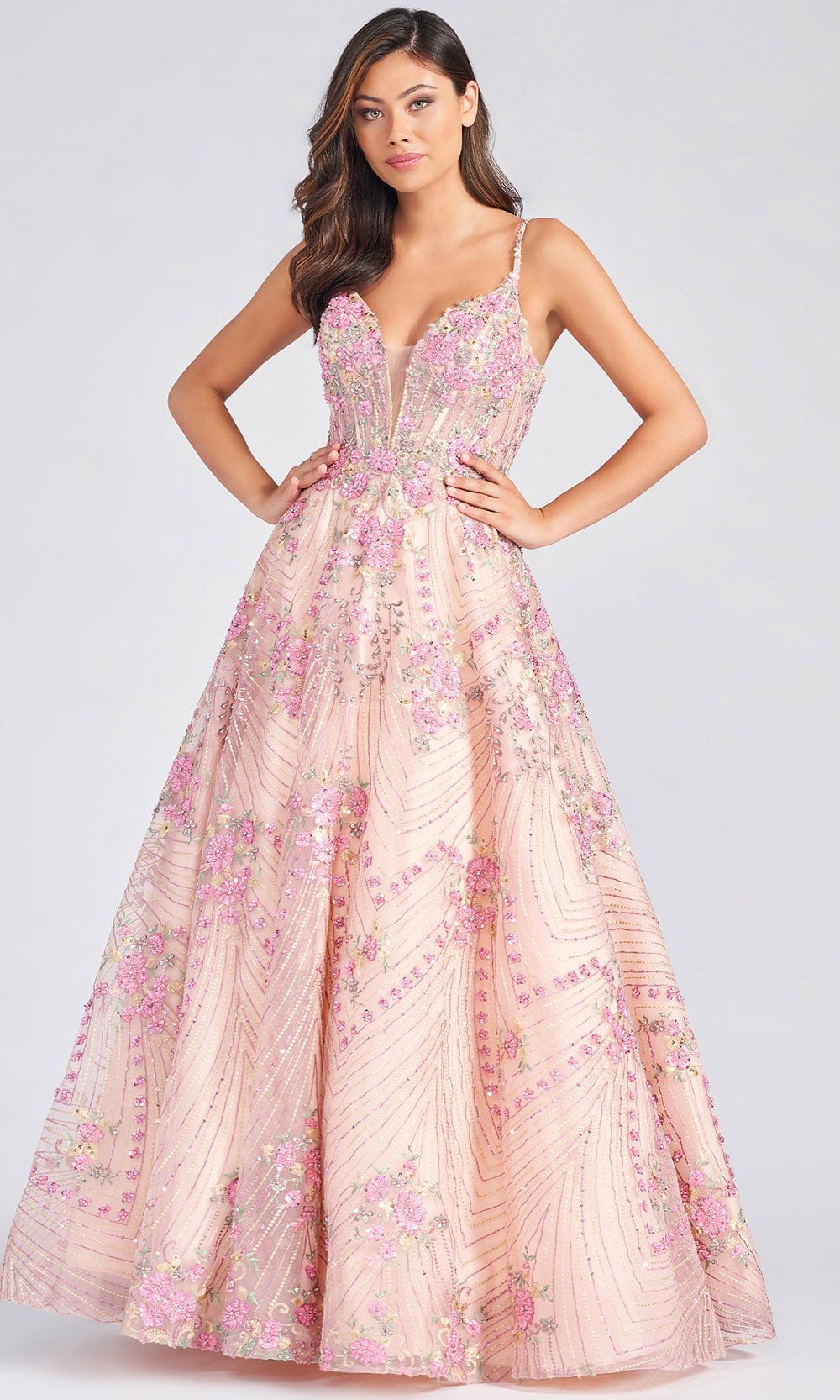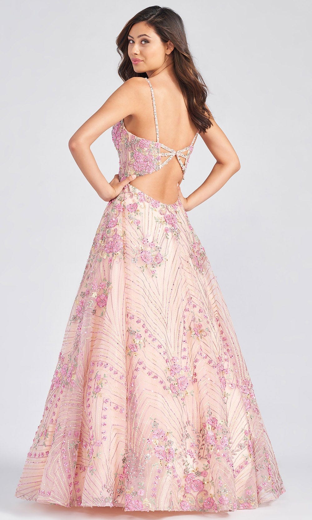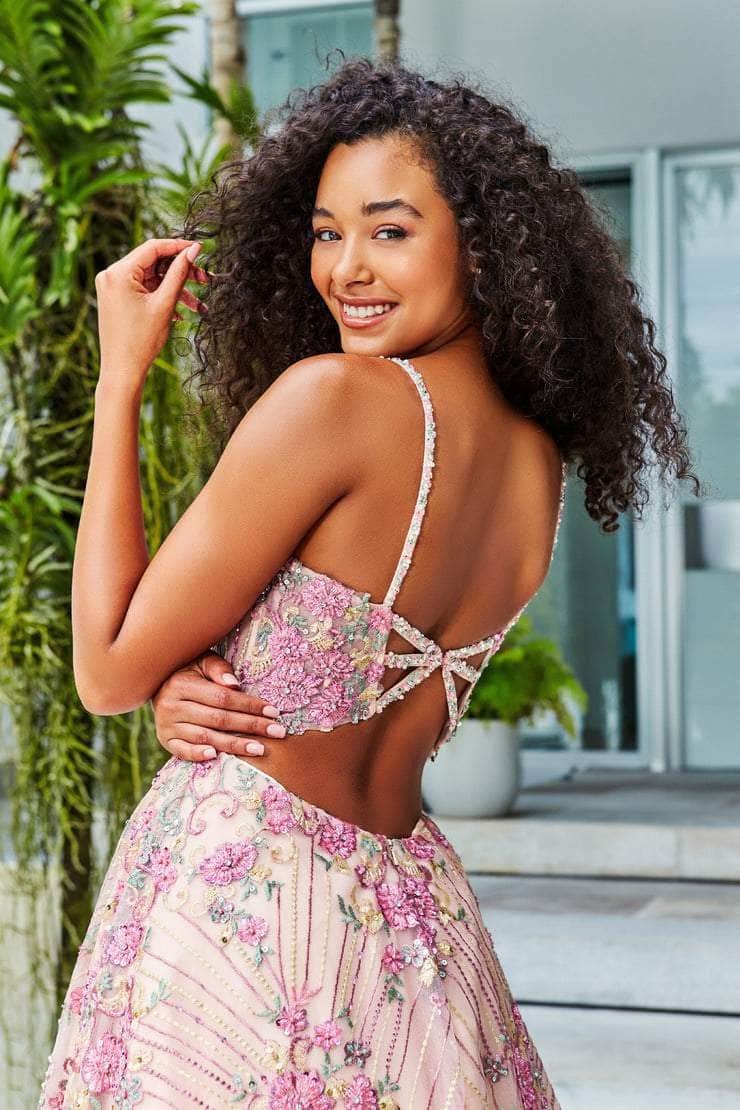 | Details: | Sleeveless, Spaghetti Straps, Sheer Inset, Corset Bodice, Floral Embroidery, Sequins, Beaded, Bandeau Back, Cutout Back, Back Zipper, Floor Length |