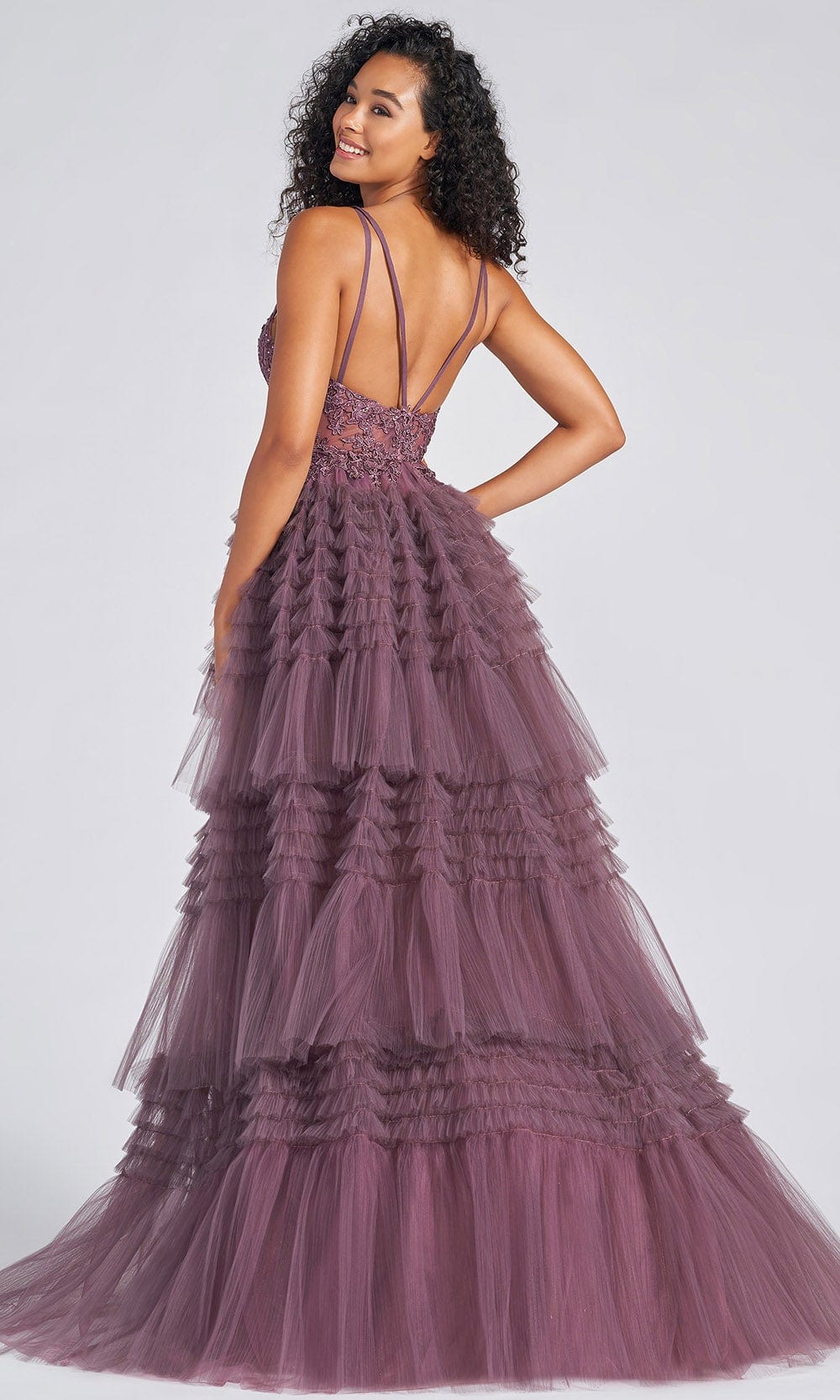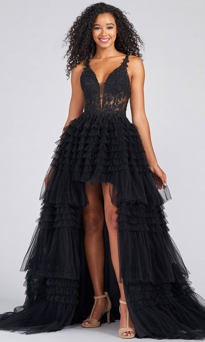Expect to be turning heads as you walk into your special event wearing this creatively romantic gown by Colette for Mon Cheri CL12281. Intricately detailed with beaded and lace appliques, this gown features a sheer corset bodice with sleeveless and plunging V neckline. The double spaghetti straps lend support to the top as the back flaunts a low open cut with a zipper closure. While the high low ballgown skirt is detailed with tiered ruffles and ends with a sweep train. This fabulous design by Colette for Mon Cheri brings a striking look meant to turn heads. Whether your style is modern trendy or timeless classic, Mon Cheri will clothe with poise, elegance and grace for your momentous occasion. Model is wearing Black and Heather colors.