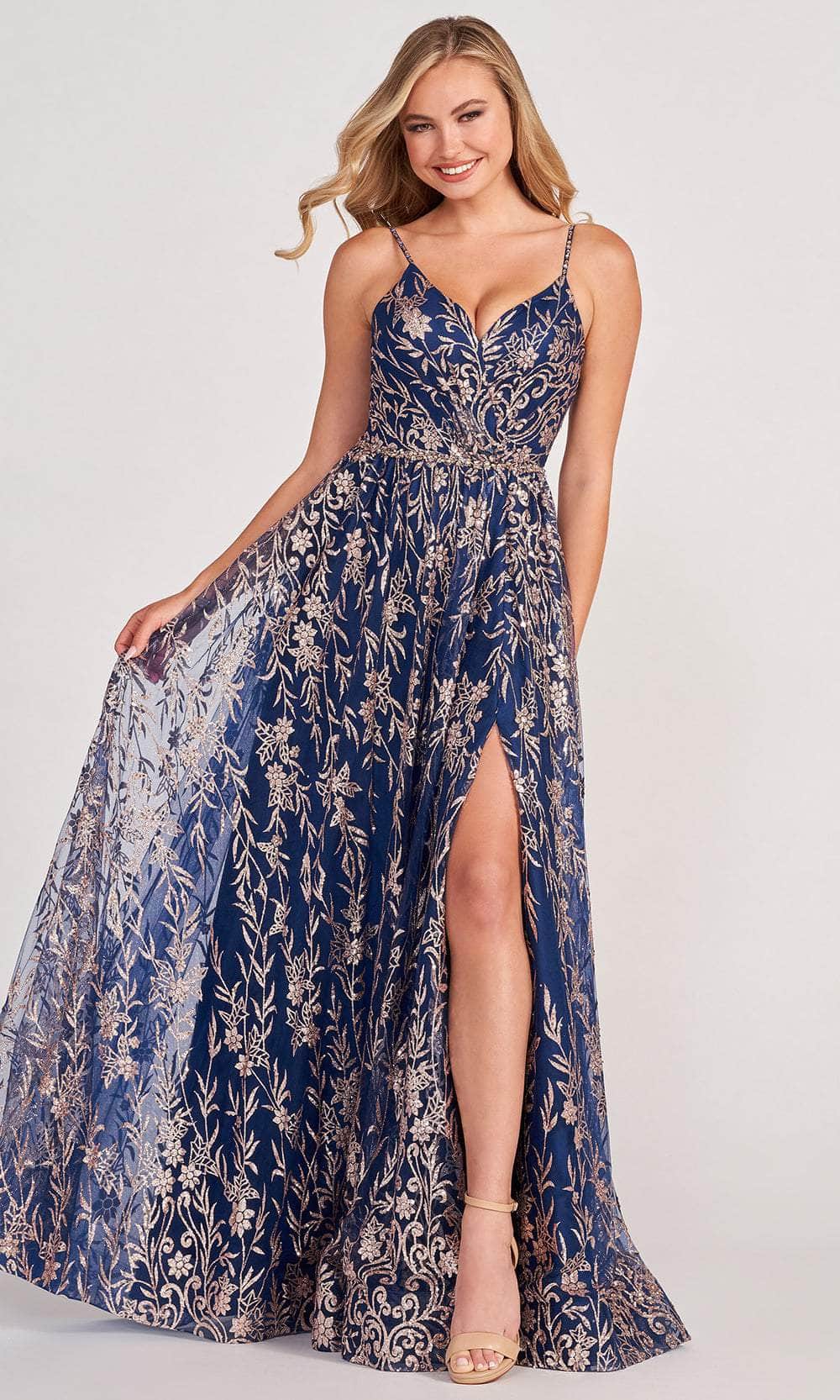 Shine brightly in this extravagant evening dress by Collette CL2022. This dress is made of novelty glitter tule fabric that is adorned with floral accents. Features a sleeveless design with a sweetheart neckline that is supported by spaghetti straps. This dress showcases a natural waistline, and a floor length A line shape skirt that has a high slit to showcase your sexy leg. The open lace up back is secured with a hidden center zipper. Feel divine when you wear this Collette creation. The models are wearing the Gold/Pewter and Navy/Gold colors