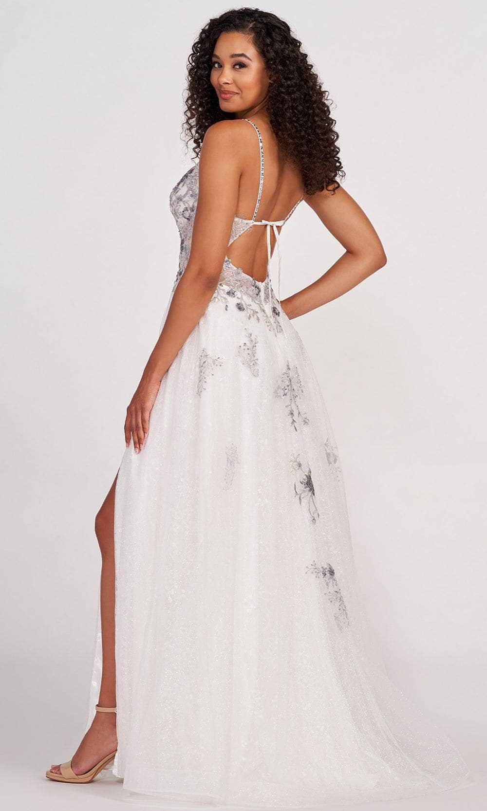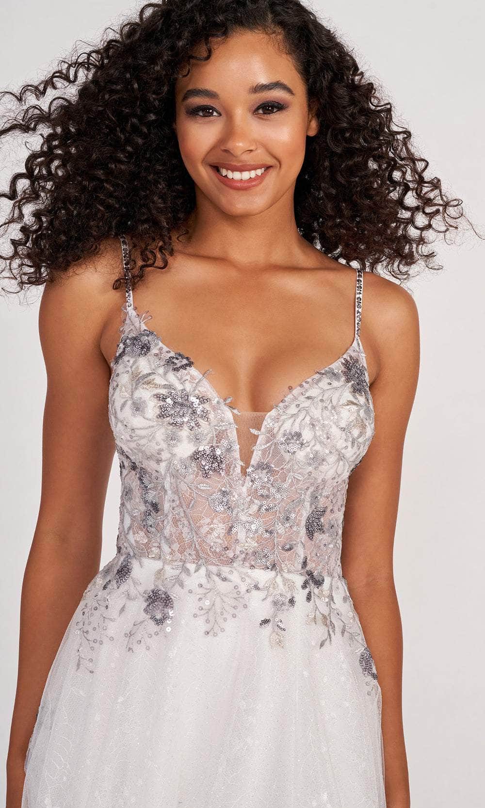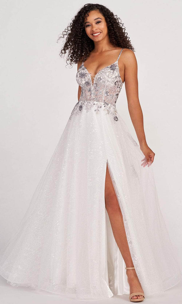 Fantasize a night of eloquent style and poise at your black-tie event while wearing this charming Mon Cheri CL2064. Make everyone stop and stare in this radiant ensemble made with tulle fabric detailed with subtle design and glitters. Cut in an A-line silhouette with a high slit. Presented with a plunging neckline suspended on spaghetti straps. Bodice is accented with sequin in floral pattern. Mon Cheri CL2064 is perfect for a standout style and flawless fit. Model is wearing White/Silver color.