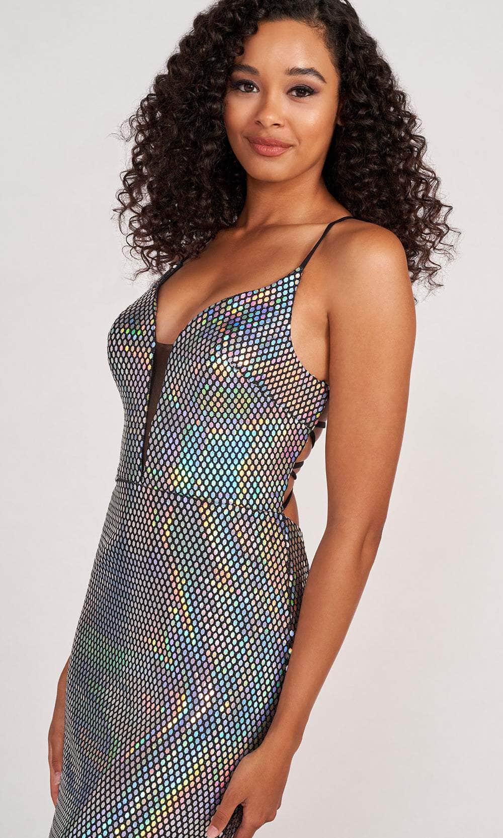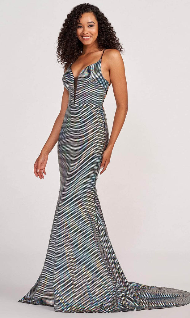 Flatter your figure with this eccentric design by Mon Cheri CL2071. Shine all day and night wearing this form-fitting dress embellished with polka dot sequins that exudes iridescent glow. Features spaghetti straps and deep neckline with a sheer panel. Back is open and styled with lots of straps in crisscross detailing, then closes in a lace-up tie. Sheath is cut in a fit and flare trumpet silhouette with sweep train finish. This Mon Cheri CL2071 is awesome for prom or for any special night event! Model is wearing Silver/Multi color.