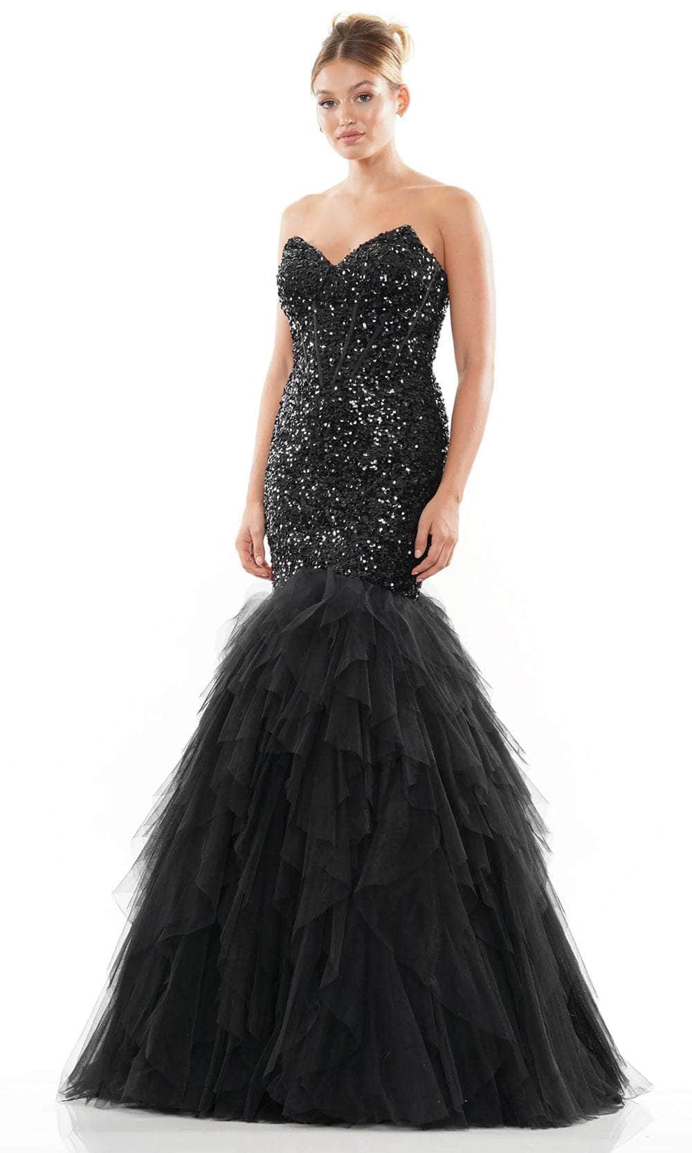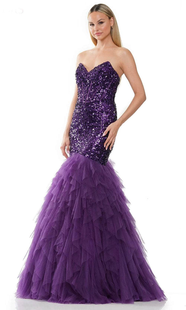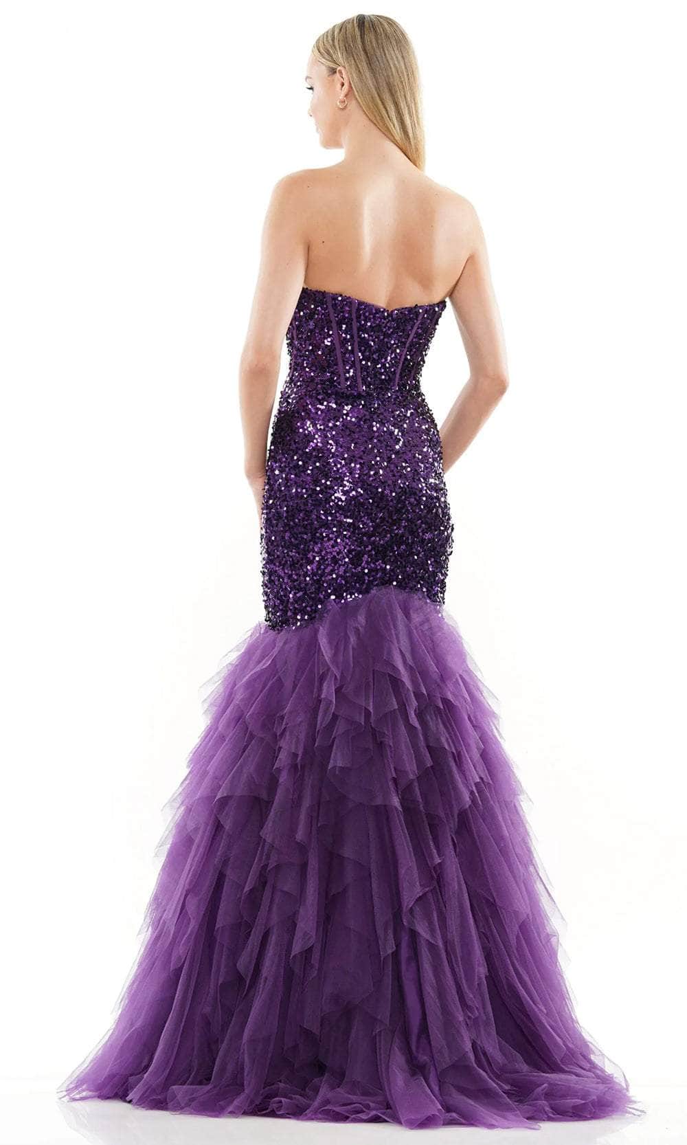 Turn heads and steal the spotlight in the glamorous Colors Dress 3202 prom dress, a masterpiece of modern design. This captivating dress features a stunning sequin and mesh bodice, adorned with intricate details. The strapless V-neckline and corset boning create a flattering silhouette. The midrise back adds a touch of sophistication, while the trumpet skirt with ruffled flare and sweeping train ensures a dramatic entrance. This Colors Dress 3202 creation is perfect for prom night, where you'll be the epitome of style and elegance. Models are wearing the Black, Light Blue, Purple, and Red colors.