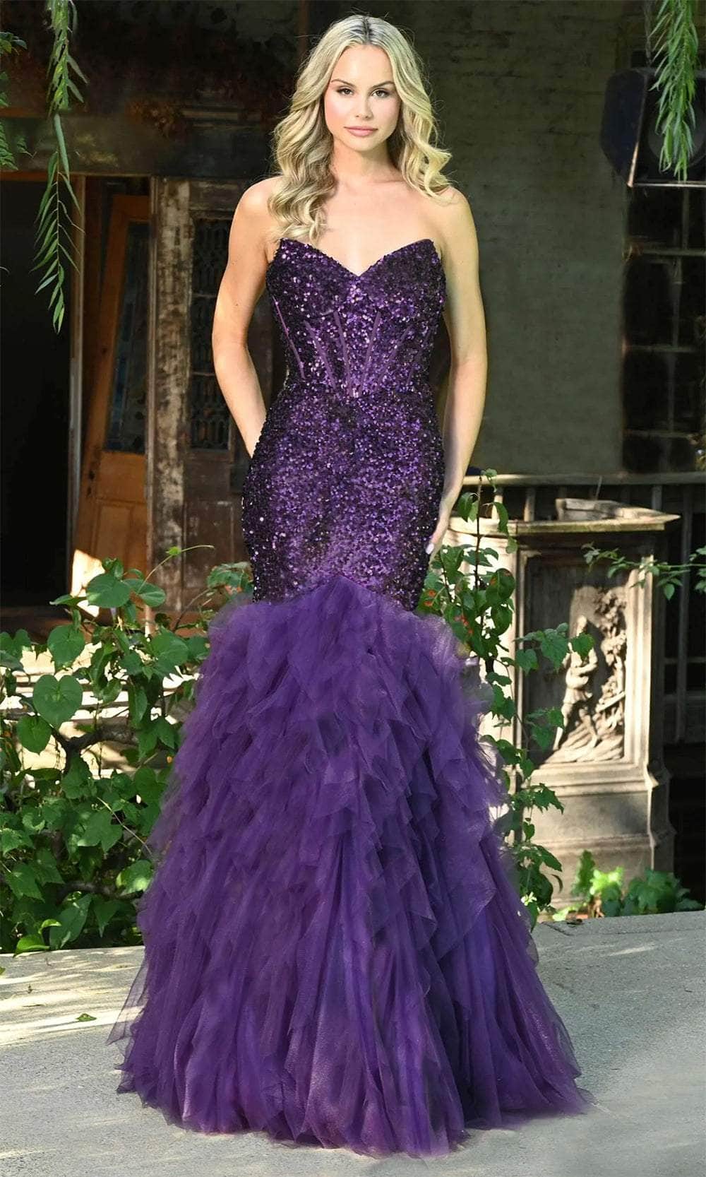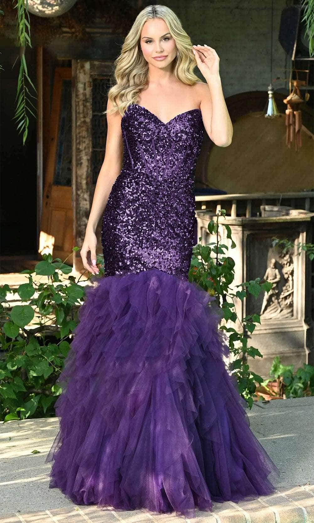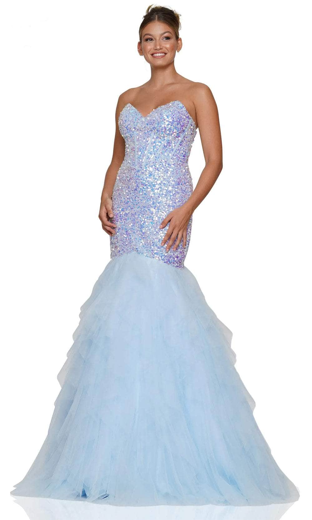 Turn heads and steal the spotlight in the glamorous Colors Dress 3202 prom dress, a masterpiece of modern design. This captivating dress features a stunning sequin and mesh bodice, adorned with intricate details. The strapless V-neckline and corset boning create a flattering silhouette. The midrise back adds a touch of sophistication, while the trumpet skirt with ruffled flare and sweeping train ensures a dramatic entrance. This Colors Dress 3202 creation is perfect for prom night, where you'll be the epitome of style and elegance. Models are wearing the Black, Light Blue, Purple, and Red colors.