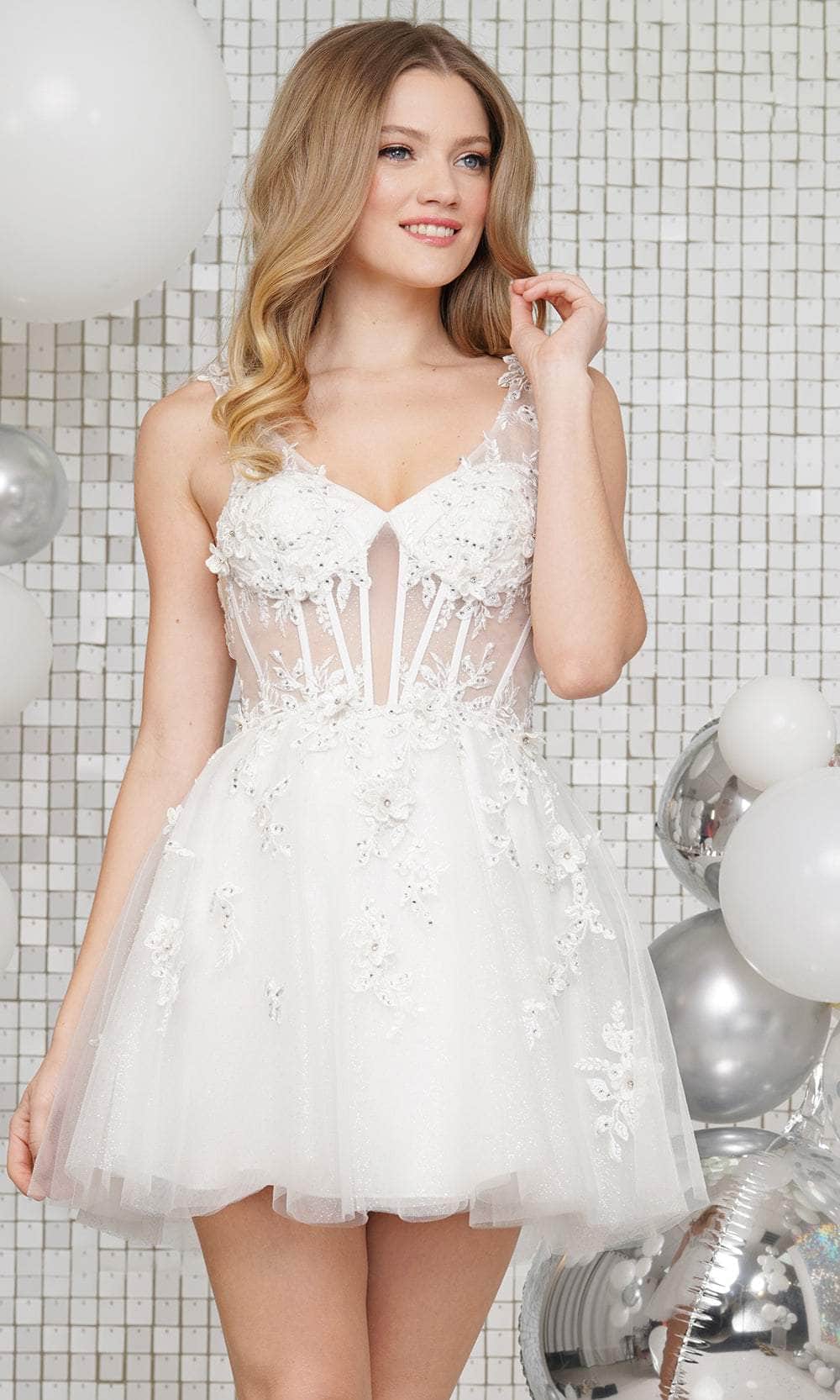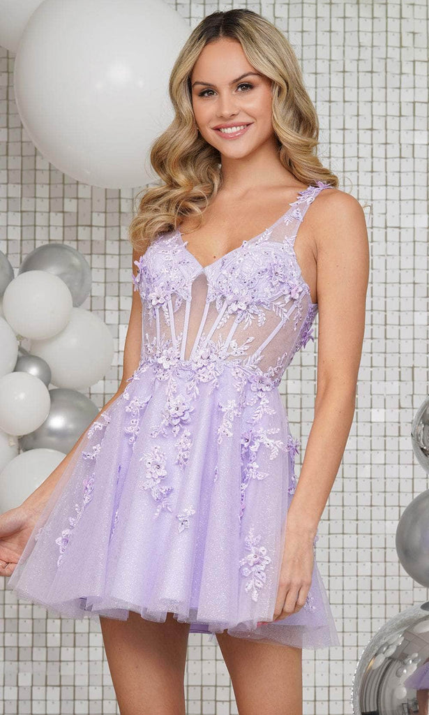 Colors Dress 3326 is a fusion of class and modern design. Its sleeveless sheer corset bodice is delicately adorned with intricate 3D floral applique and embroideries, complemented by a graceful V-neckline. The open back mirrors the sophistication of the front, secured with a central zipper closure for a perfect fit. Showcasing a short-length A-line silhouette skirt, this ensemble exudes timeless charm and contemporary allure. Perfect for any occasion, Colors Dress 3326 promises to elevate your style with its captivating beauty. Models are wearing Hot Pink, Lilac and Off-White colors.
