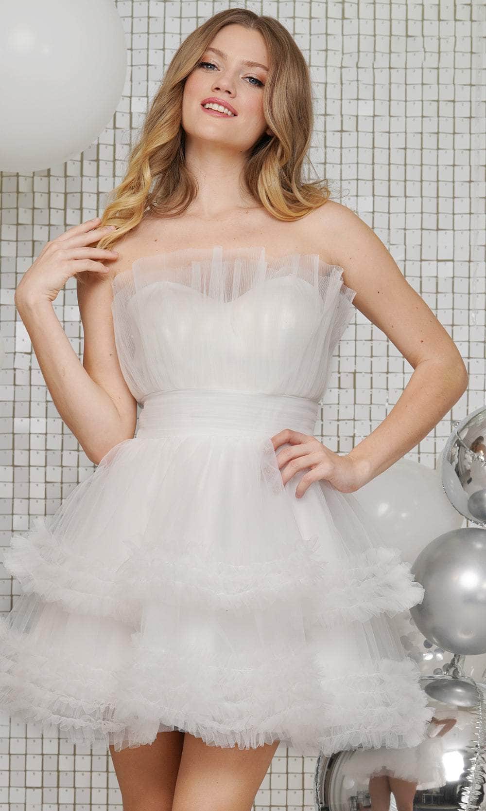 Step into the limelight with the captivating Colors Dress 3332 homecoming dress, a fusion of contemporary chic and timeless allure. Crafted from crinkled tulle layered over a tailored lining, this gown gently embraces your feminine contours, radiating an air of enduring sophistication. The strapless bodice boasts a sweetheart neckline adorned with sheer crinkled tulle overlay for a subtle hint of allure. Completing the ensemble, the midrise back features a concealed zipper closure, ensuring a flawless appearance. The A-line silhouette presents a layered design with charming ruffled trims, finishing with a mini hem for a playful yet elegant touch. Command attention at your upcoming event with the enchanting Colors Dress 3332. Models are wearing the Black, Deep Green, Fuchsia, and White colors.