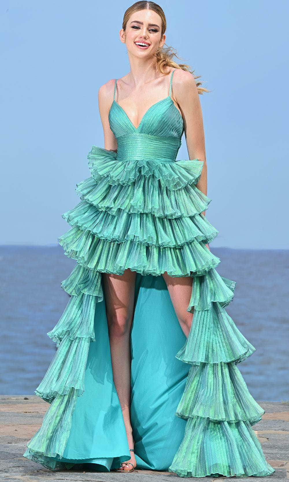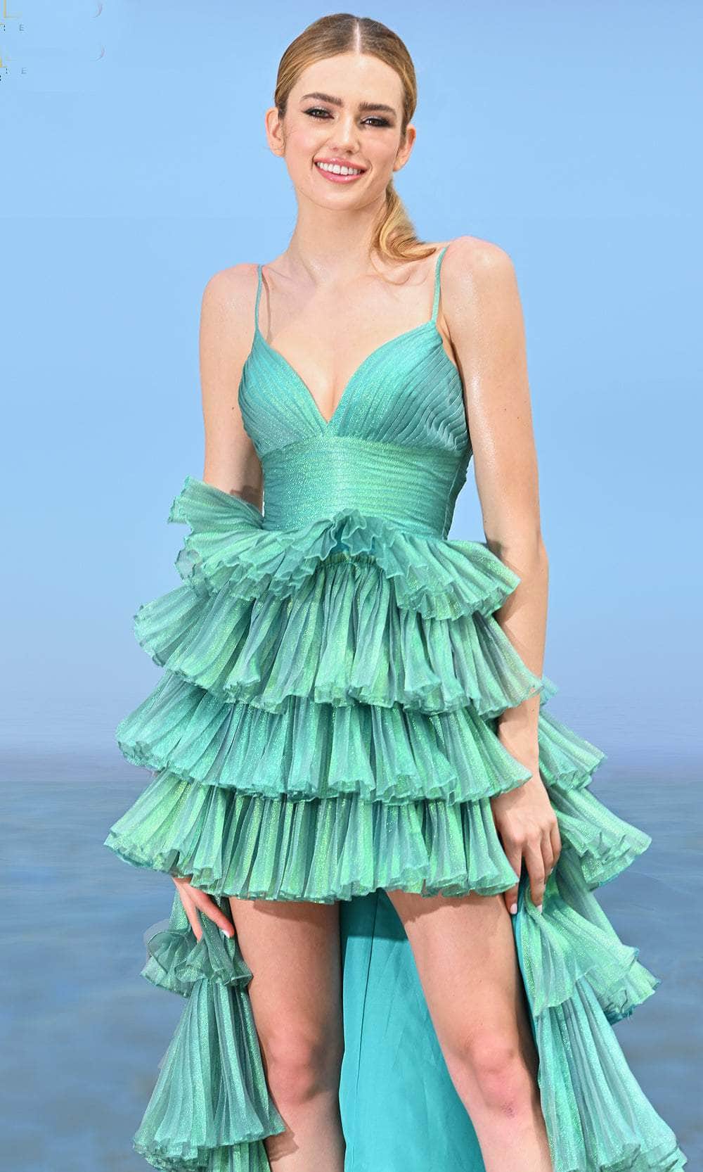 Steal the spotlight effortlessly in this fashionable Colors Dress 3462. Made from metallic organza with a pleated design throughout, this gown is the epitome of luxury and elegance. Striking details include the v-neckline held by spaghetti straps and a wide waistband. A concealed zipper closure and open design in the back add a hint of allure. The A-line skirt mesmerizingly cascades into a high-low hemline with a ruffle-tiered design that gives a playful twist. Perfect for getting the party started, this Colors Dress 3462 exudes style and excitement. Models are wearing Green, Rose, and Royal Purple colors.