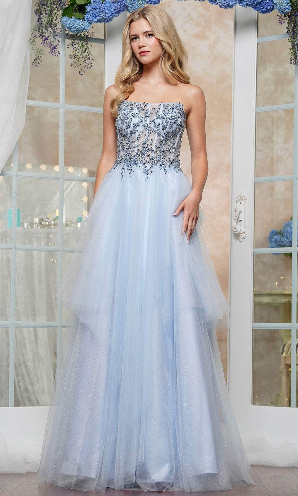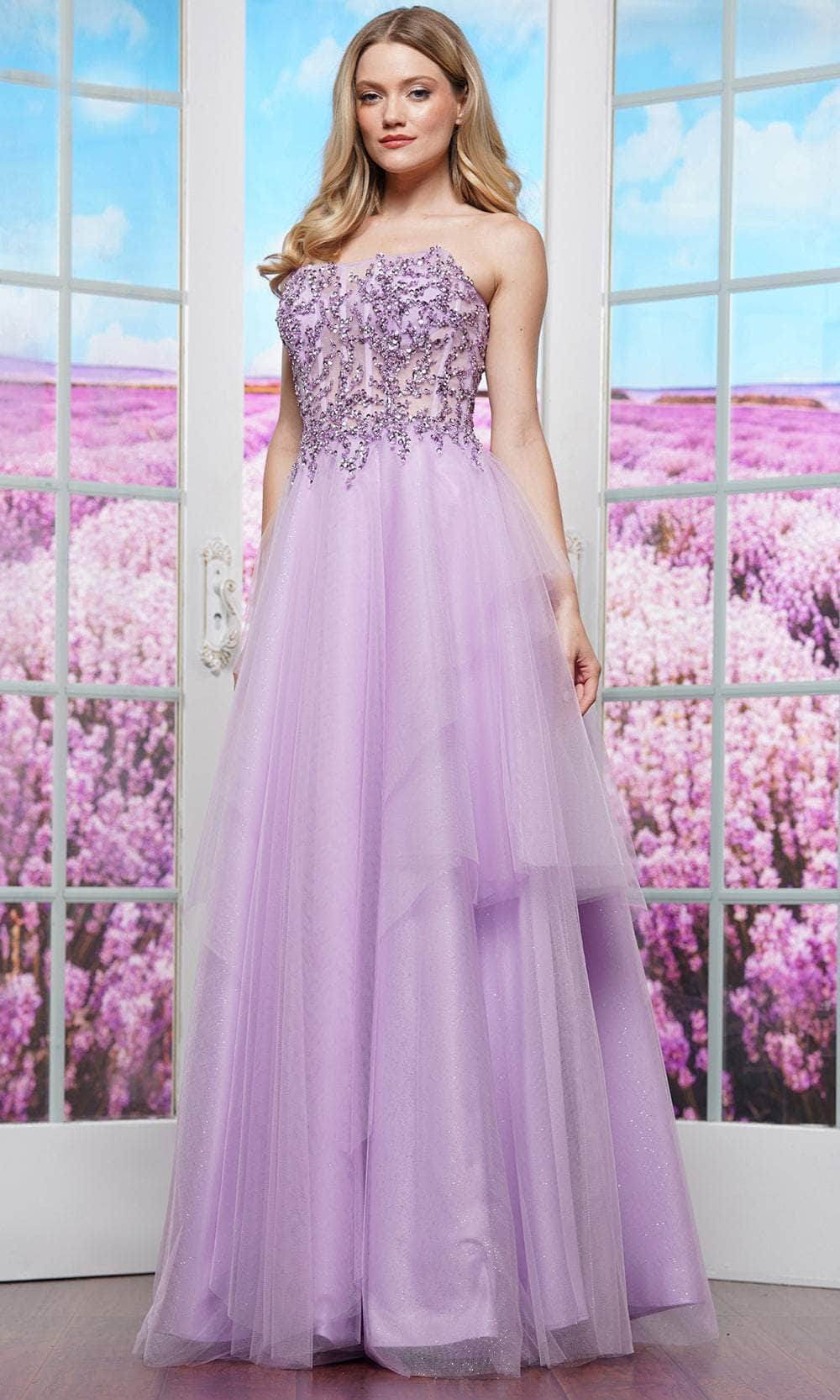 Radiate timeless elegance with Colors 3475. This strapless gown showcases a rhinestone-embellished corset bodice that sparkles with sophistication. The straight-across neckline accentuates the décolletage, while ruffled details add volume and charm. The floor-length skirt flows into an A-line silhouette for graceful movement. A lace-up tie and back zipper ensure a secure, tailored fit, making this Colors 3475 a show-stopping choice for any special occasion. Models are wearing Blue and Lilac colors.