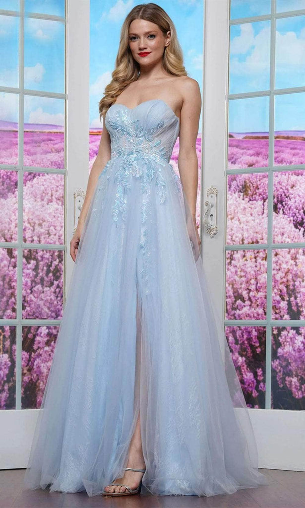 Discover the art of elegance with Colors Dress 3484 prom dress. A gown that exudes luxury and style. This captivating design features a stunning silhouette adorned with ruched tulle. The strapless sweetheart neckline, embellished with appliques, creates a delicate and feminine look. The corset bodice and lace-up back ensure a perfect fit, while the layered A-line skirt, with its high slit and sweeping train, adds a touch of elegance and grace. Step into the limelight in the Colors Dress 3484 prom dress. Models are wearing the Light Blue, Red, Deep Green, and Yellow colors.
