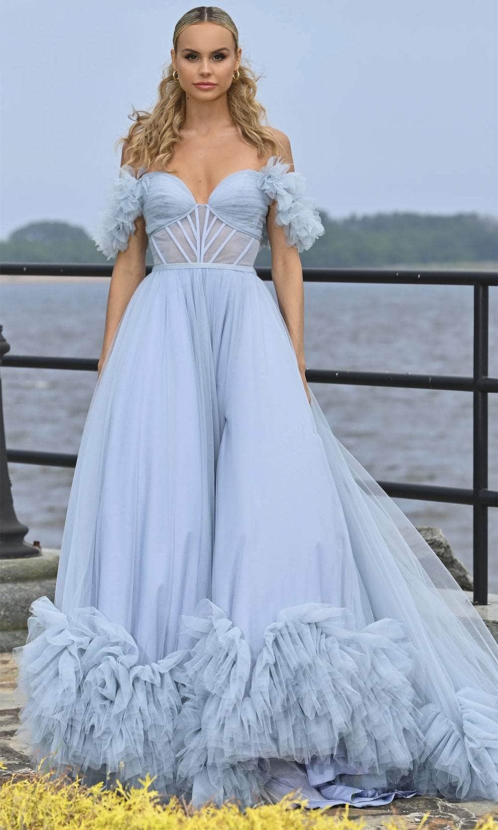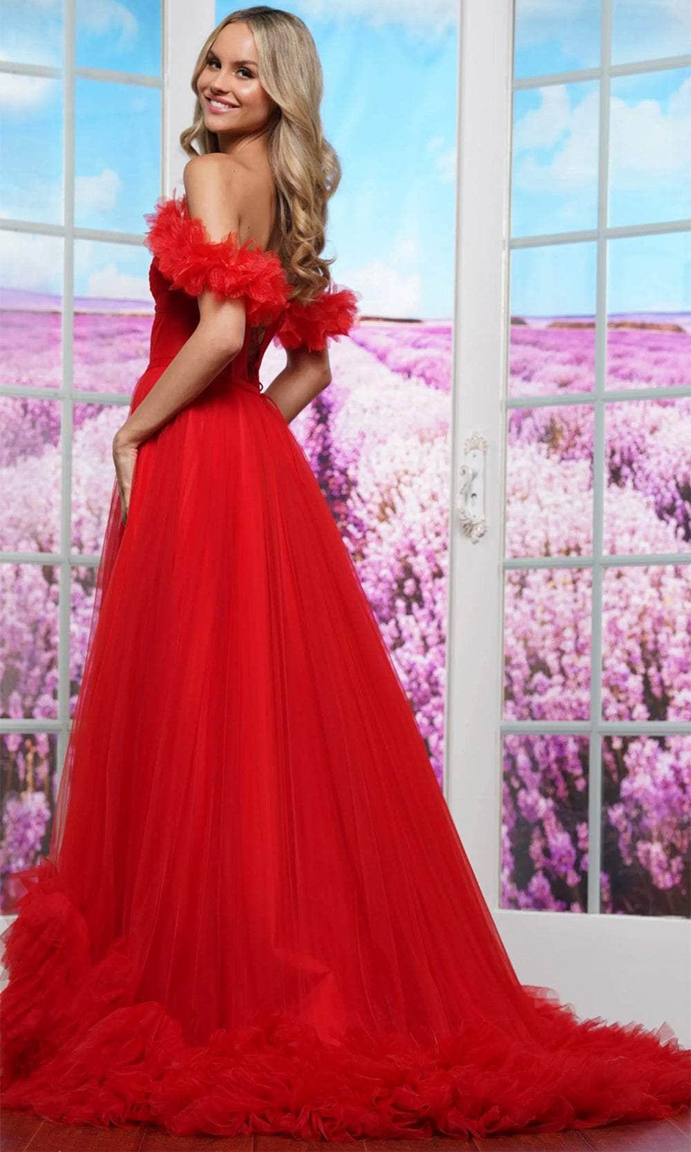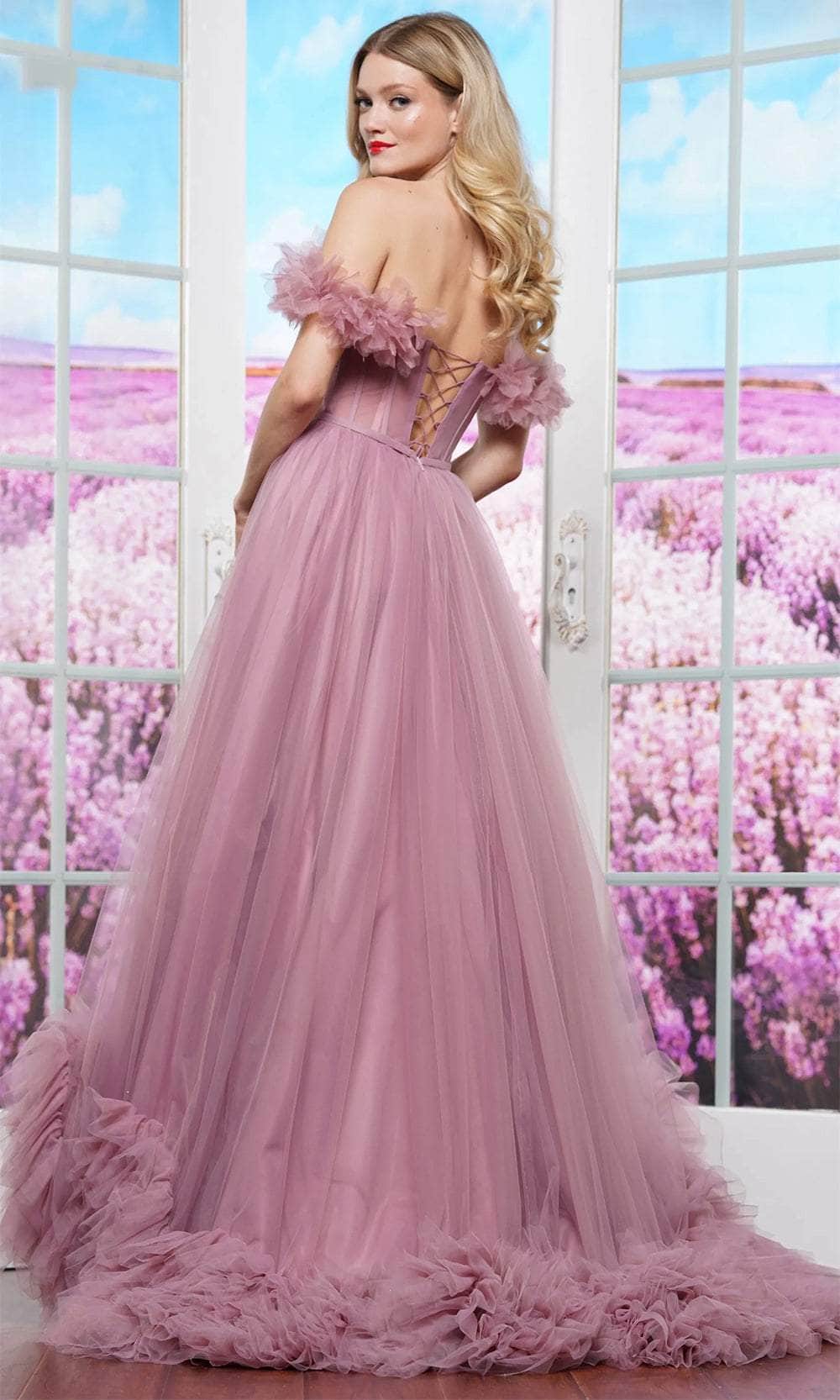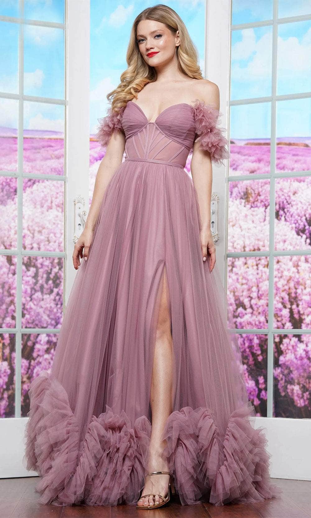 Prepare to dazzle in the exquisite Colors Dress 3485 prom dress , where elegance meets glamour. This captivating dress features a stunning silhouette adorned with tulle fabric. The ruffle-draped off-shoulder sleeves create a delicate and feminine look. The corset boning and midrise back ensure a perfect fit, while the A-line skirt with a high slit, ruffle trim, and sweeping train adds a touch of drama and elegance. This Colors Dress 3485 creation is perfect for prom night, where you'll be the epitome of timeless beauty. Models are wearing the Black, Deep Mauve, Red, and Wedgewood colors. colors.