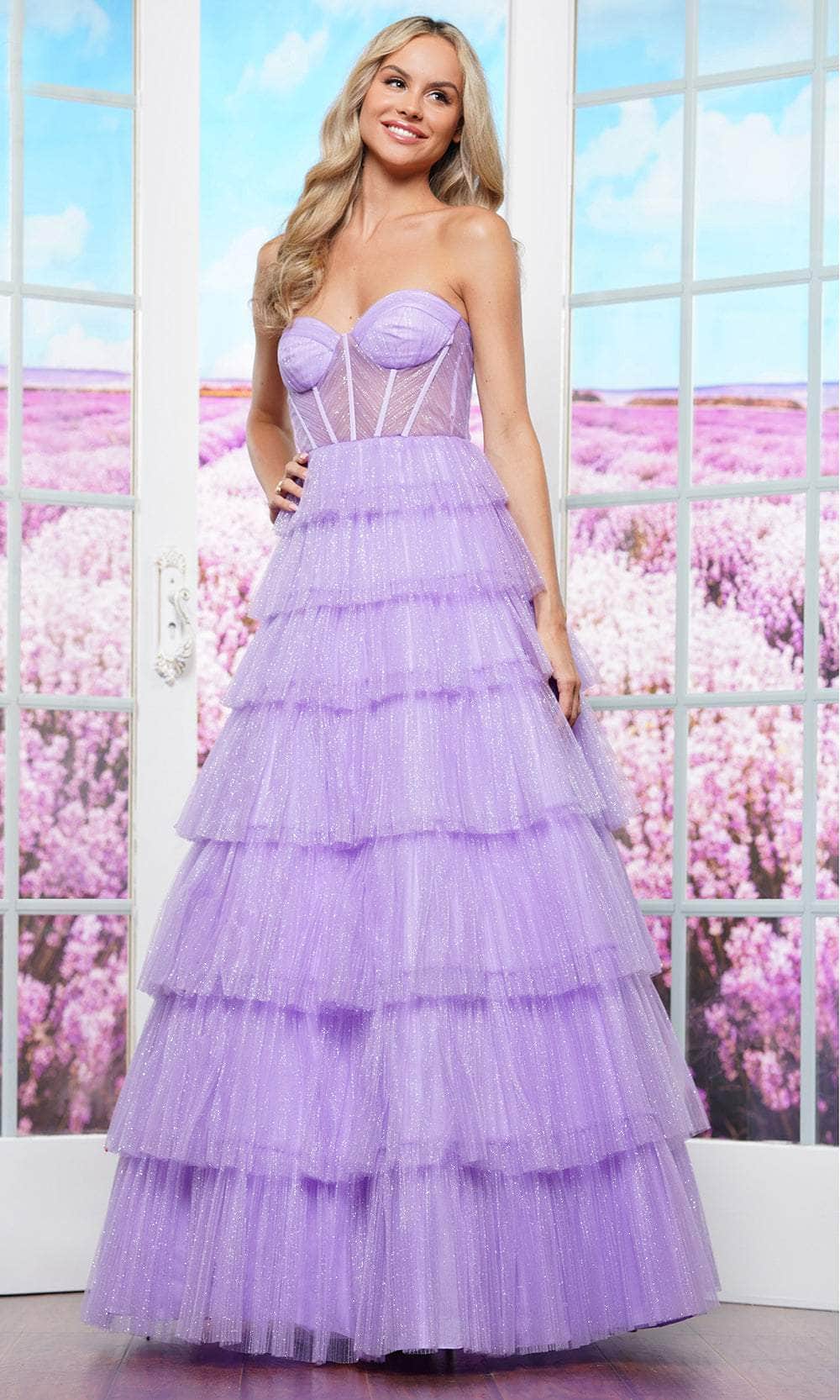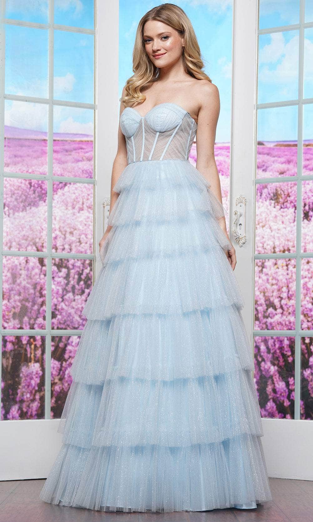 Step into a world of enchantment with the Colors Dress 3491. This strapless masterpiece features a sweetheart neckline that exudes romance, gracefully leading into a midrise lace-up back that allows you to adjust the fit. The illusion corset boning bodice highlights the curves with elegance. A pleated glittered mesh gives this gown an ethereal sparkle and luxurious feel. The ballgown skirt cascades into a full-length hem, accentuated with ruffle tiers that bring depth and grandeur. This Colors Dress 3491 is a must-have for making a captivating entrance. Models are wearing Black, Light Blue, and Lavender colors.