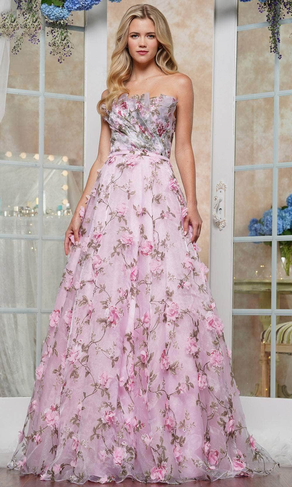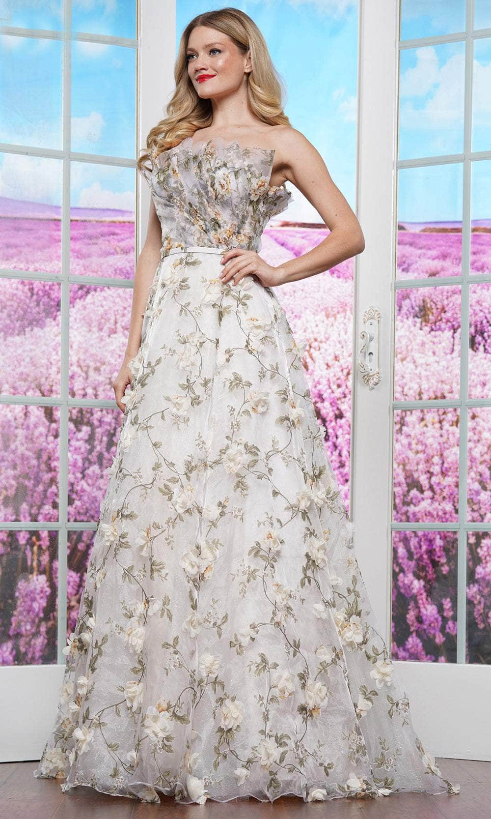 Experience fairytale glamour with Colors 3502. This enchanting strapless gown features a unique tulip-shaped top with ruched detailing and exquisite 3D floral appliqués. The open back, complemented by a lace-up tie and back zipper, adds a touch of romance. Flowing into a floor-length ballgown silhouette, the skirt ends in a graceful train, Colors 3502 ensures you an unforgettable entrance. Perfect for making a statement at any grand event. Models are wearing Lilac and Ivory colors.