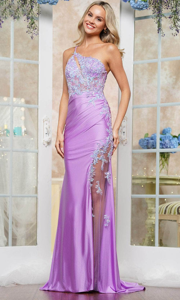 Unleash your inner goddess and exude elegance in this Colors Dress 3513 masterpiece. The floral embroidery and beadwork on this sleeveless gown make it a show-stopper. The captivating details include a one-shoulder thin strap, an asymmetric neckline with a sultry bust cutout, and bandeau lace-up back. Designed to embrace your curves, the skirt has soft ruching and gracefully forms a sheath silhouette. An illusion thigh-high slit in the side adds a seductive finish that turns heads. You will be envied in an unbeatable Colors Dress 3513. Models are wearing Lilac, Navy, and Pink colors.