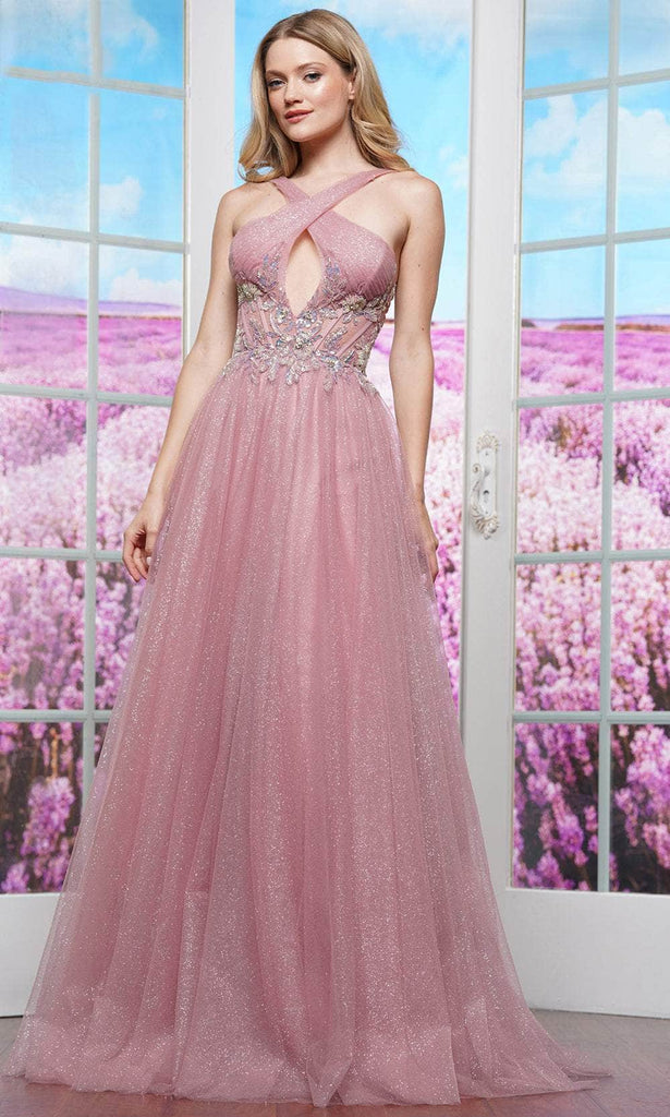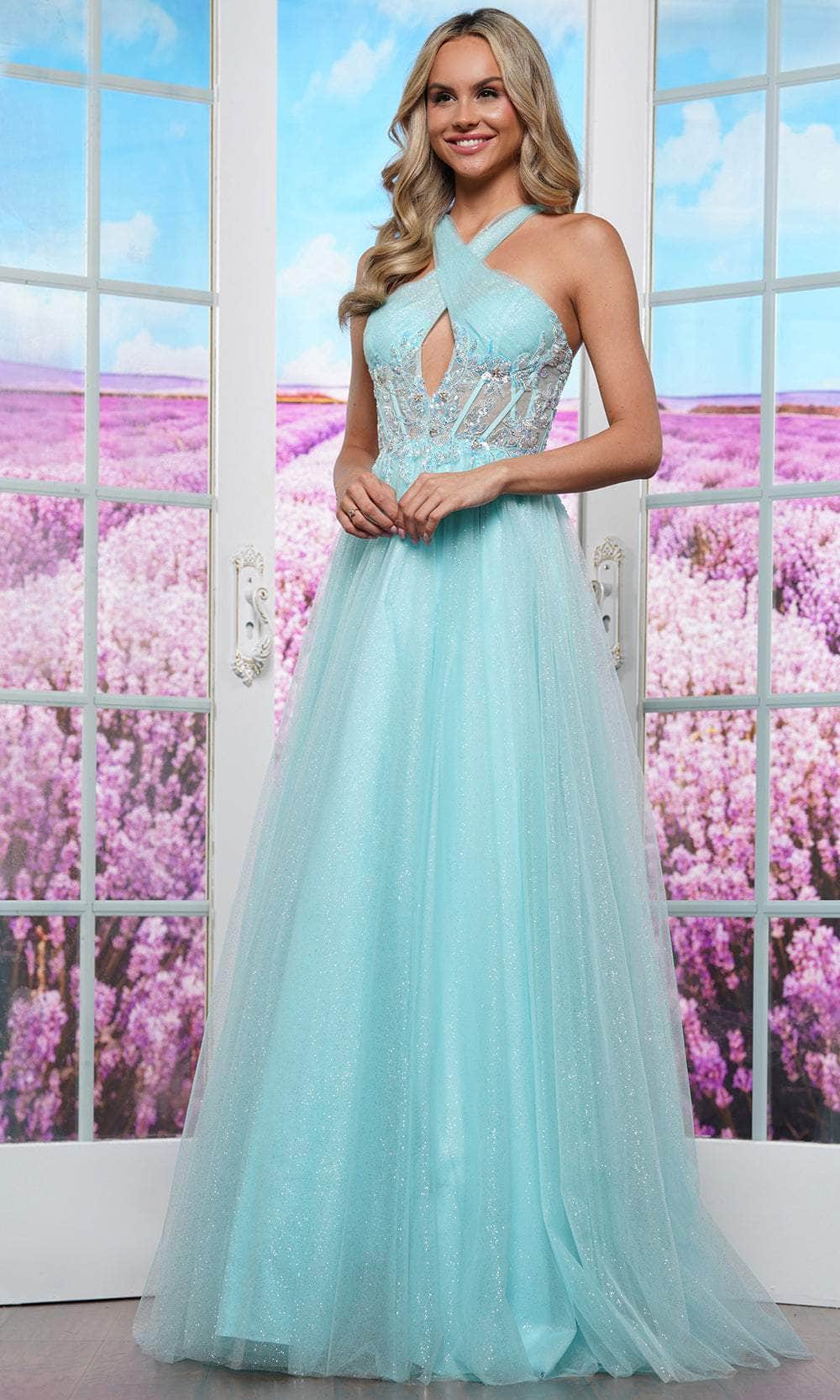 Make an extraordinary statement in this elegant design from Colors Dress 3514. The sleeveless halter neckline crosses beautifully at the front and back, revealing a sultry cutout in the bust. Additional highlights are the see-through corset bodice decorated with sparkling sequins and lace appliques. A lace-up tie closure in the back allows for a tailored fit. The glitter mesh ballgown skirt flows dramatically from the waist and ends in a full-length hemline. Step into the room and instantly draw all eyes to you in the Colors Dress 3514. Models are wearing Mauve, Navy, and Tiffany Blue colors.