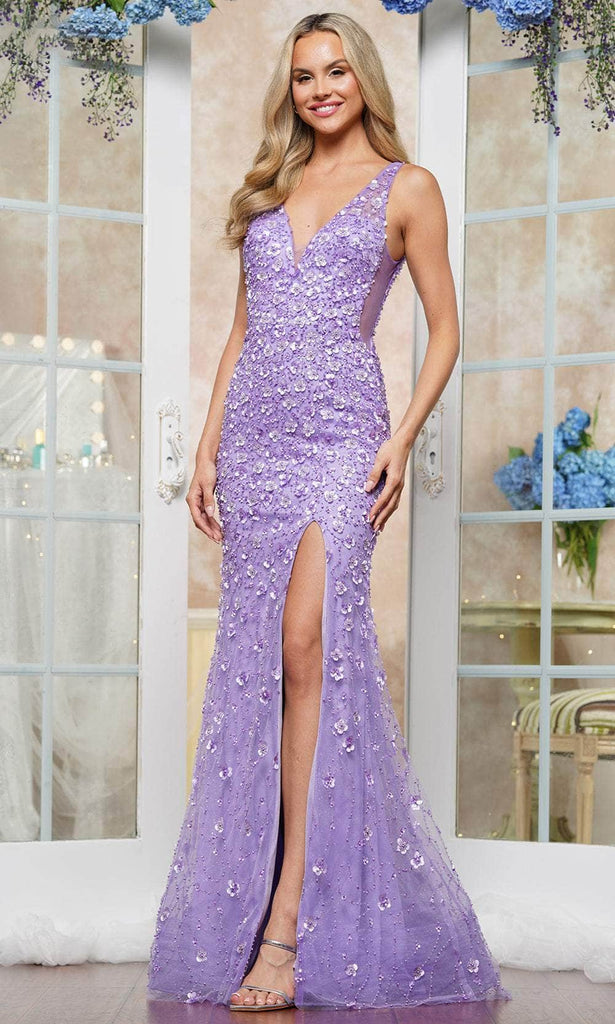 Capture every eye from the moment you enter the hall in this sparkling Colors Dress 3538. The sleeveless outfit features a curve-hugging bodice decorated with 3D floral appliques and beadworks. Wide straps frame the plunging V-neckline and a sophisticated midrise V-back. The illusion cutout in the side waist brings a modern touch that enhances your curves. The sheath skirt falls beautifully to the full-length hem and opens a thigh-high leg slit for alluring leg exposure. Flaunt your poise and confidence effortlessly in this Colors Dress 3538 creation. Models are wearing Lavender, Mauve, and Navy colors.