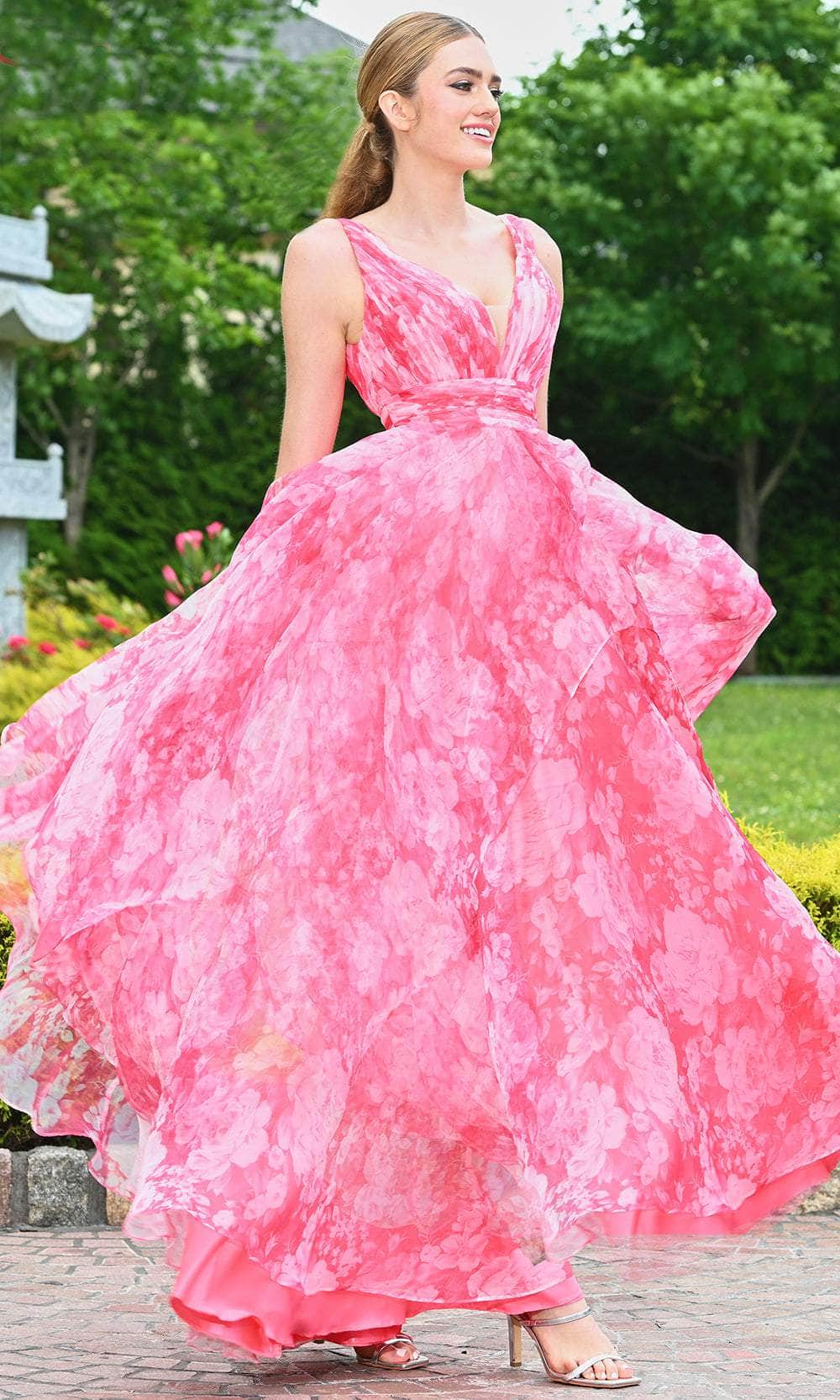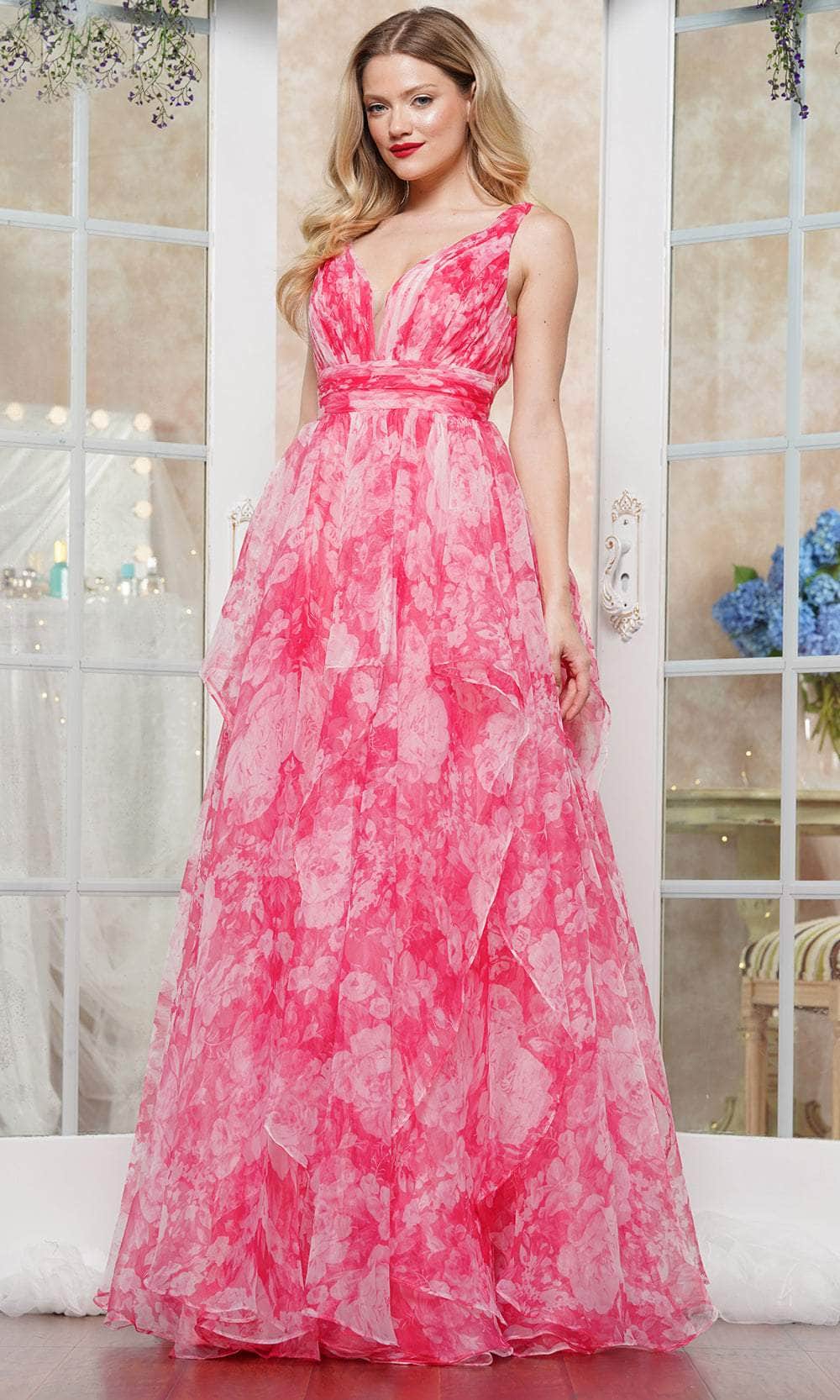 You will be an enchanting beauty in Colors 3545. This sleeveless gown features a floral-printed design and a pleated bodice that leads to a flattering V-neckline. The floor-length A-line skirt flows gracefully, enhanced by delicate ruffle accents for a touch of charm. The V-shaped back, secured with a back zipper, completes the look with elegance. Perfect for any special occasion, this Colors 3545 exudes sophistication and effortless grace. Models are wearing Watermelon and Lavender colors.