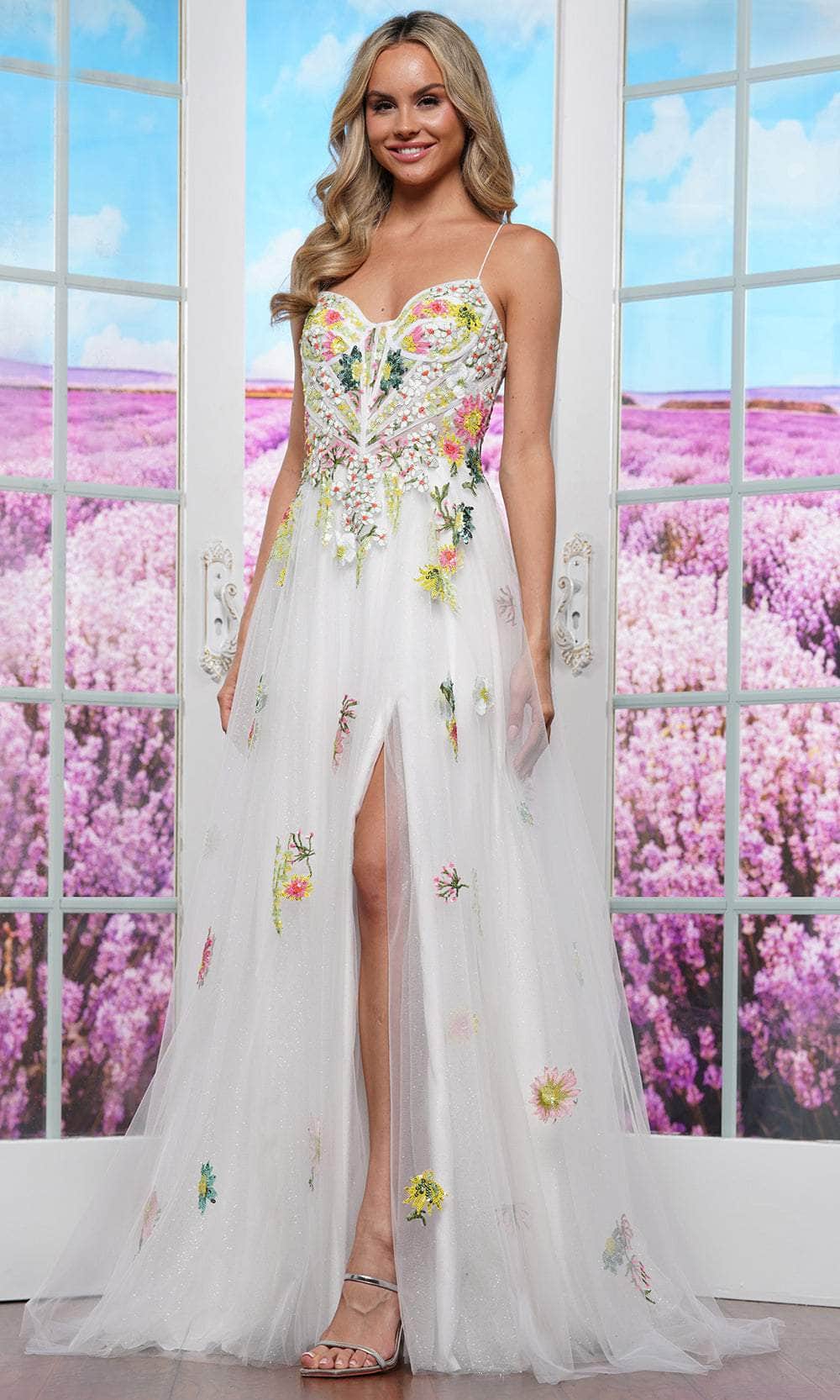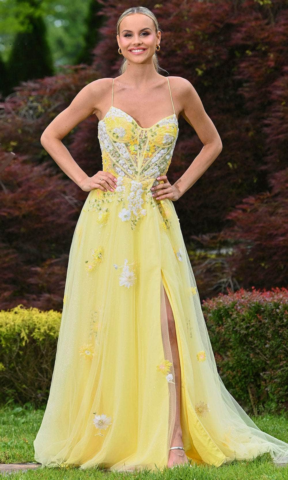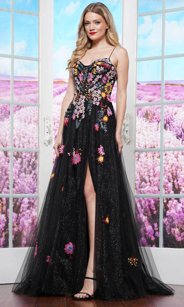 Step into a world of charm with the Colors Dress 3582 masterpiece. This sleeveless gown sparkles under the light, fashioned from glitter tulle fabric with multicolor floral sequins and embroidery. A sweetheart neckline is held in place by spaghetti straps, while the sexy open back has customizable lace-up tie detailing for a great fit. The A-line skirt flows beautifully to the sweeping train with a front thigh-high leg slit for an ethereal movement. Step into your prom night feeling like a princess in this Colors Dress 3582. Models are wearing Black, Off White, and Yellow colors.