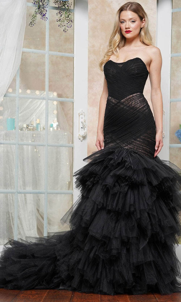 | Details: | Strapless, Ruched Bodice, Ruffled Skirt, Mid-Open Back, Lace-Up Closure, Sweep Train |