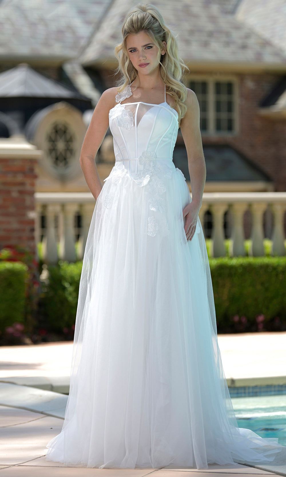 | Details: | Halter Thin Straps, Floral Appliques, Illusion Corset Bodice, Lace-Up Back, Sweep Train |