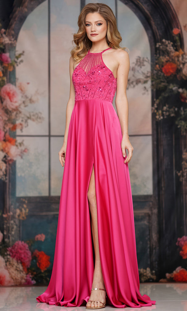 With a sleek silhouette and intricate beading, Colors Dress 3822 offers a look that is designed to impress. The sleeveless gown features a halter neckline and fitted bodice, highlighted by carefully placed beaded embellishments across the illusion top. The skirt glides into an A-line shape with a high slit that enhances its contemporary charm. Colors Dress 3822 strikes the perfect balance between striking design and classic sophistication, presenting a style that captures attention while remaining polished and unforgettable. Models are wearing Deep Sage, Hot Pink, Lavender, and Navy colors.
