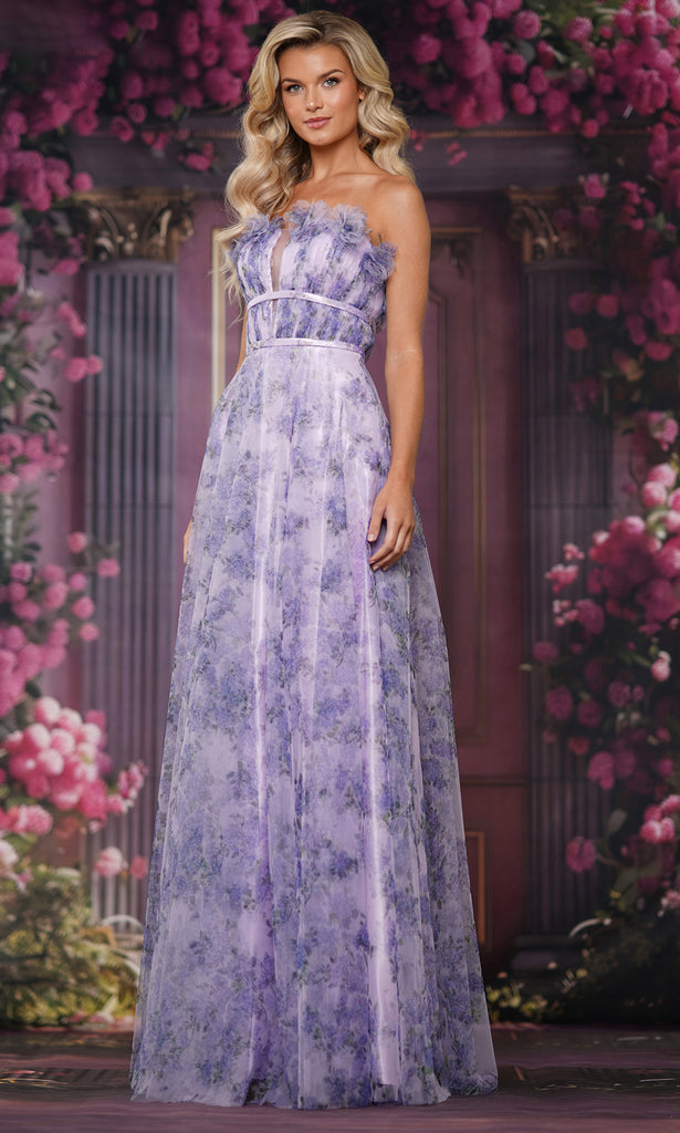 Colors Dress 3831 exudes a whimsical charm that is ideal for evenings where beauty should feel effortless and memorable. The strapless gown begins with a plunging illusion neckline framed by 3D floral trim that introduces texture and softness. A pair of slim waistbands highlights the figure with understated elegance. From the natural waistline, the A-line silhouette flows to the floor in tulle fabric with a floral print that enhances its airy movement. Perfect for celebrations that require elegance with a distinctive flair, Colors Dress 3831 captures the spirit of modern romance. Models are wearing Lilac, Peach, and Sage colors.