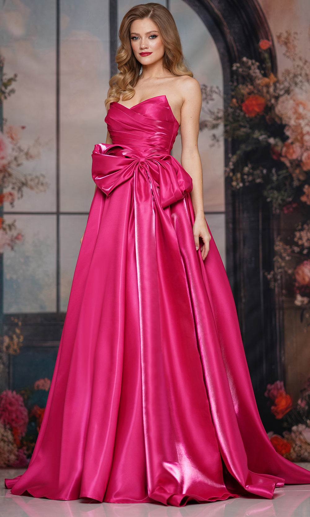 Colors Dress 3860 brings a sense of grandeur to any special event with its bold yet elegant design. A strapless v-neckline enhances the fitted bodice, complemented by strategic ruching that flatters the waist. At the side, a dramatic oversized bow serves as a focal point, giving the gown a memorable flourish. From there, the A-line skirt flows in mirror Mikado to the floor, creating graceful motion with each step. For evenings that require distinction and charm, Colors Dress 3860 delivers sophistication with an unforgettable silhouette. Models are wearing Black, Gold, and Hot Pink colors.